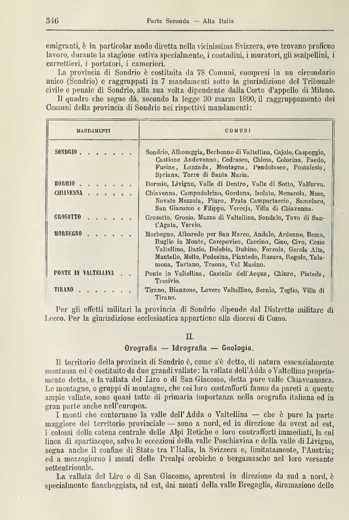 Il territorio della provincia di Sondrio è, come s'è detto, di natura essenzialmente montuosa ed c costituito da due grandi vallate : la vallata dell'Adda o Valtellina propriamente detta, e la vallata del Liro o di San Giacomo, detta pure valle Chiavcnnasca. Le montagne, o gruppi di montagne, che coi loro contrafforti fanno da pareti a queste ampie vallate, sono quasi tutte di primaria importanza nella orografia italiana ed in gran parte anche nell'europea.