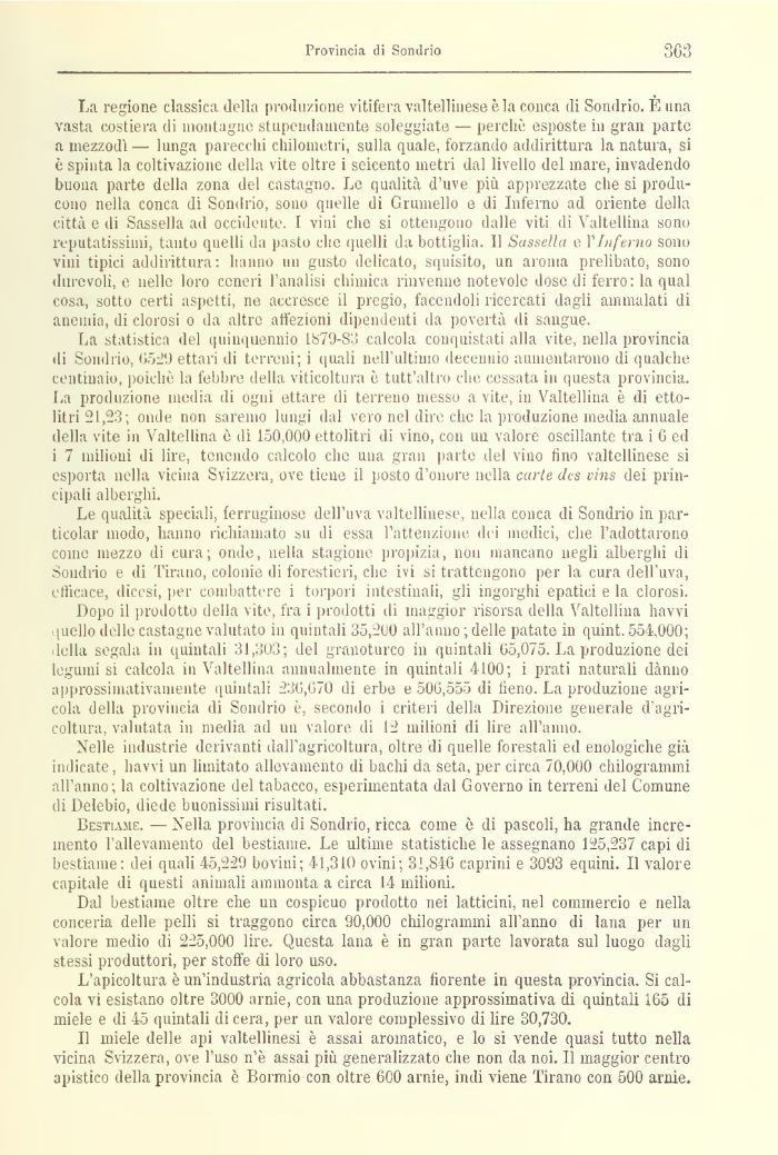 La statistica del quinquennio IS79-S3 calcola conquistati alla vite, nella provincia di Sondrio, 0529 ettari ili terreni; i quali nell'ultimo decennio aumentarono di qualche centinaio, poiché la febbre della viticoltura è tutt'altro che cessata in questa provincia. La produzione media di ogni et tare ili terreno messo a vite, in Valtellina è di ettolitri 21,23; onde non saremo lungi dal vero nel dire che la produzione inedia annuale della vite in Valtellina è ili 150.000 ettolitri di vino, con un valore oscillante tra i G ed i 7 milioni dì lire, tenendo calcolo che una gran parte del uno fino valtelliuese si esporta nella vicina Svizzera, ove tiene il posto d'onore nella carie dles vins dei principali alberghi.