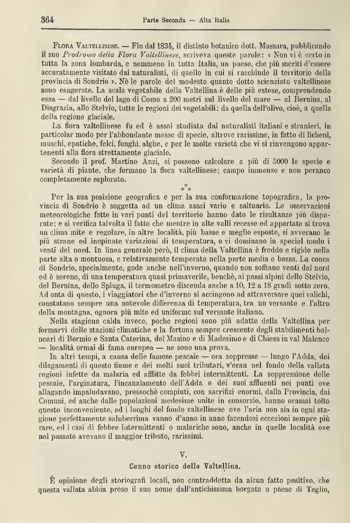 Flora Valtellinese. — Fin dal 1834, il distinto botanico dott. MasSara, pubblicando il suo Prodromo della Flora Valtellinese, scriveva queste parole: « Non vi è certo m tutta la zona lombarda, e nemmeno in tutta Italia, un paese, elie più meriti d'essere accuratamente visitato dai naturalisti, di quello in cui si racchiude il territorio della provincia di Sondrio ». Nò le parole del modesto quanto dotto scienziato valtellinese sono esagerate. La scala vegetabile della Valtellina è delle più estese, comprendendo essa — dal livello del lago di Como a 200 metri sul livello del mare — al Bernina, al Disgrazia, allo Stelvio, tutte le regioni dei vegetabili : da quella dell'olivo, cioè, a quella della regione glaciale.