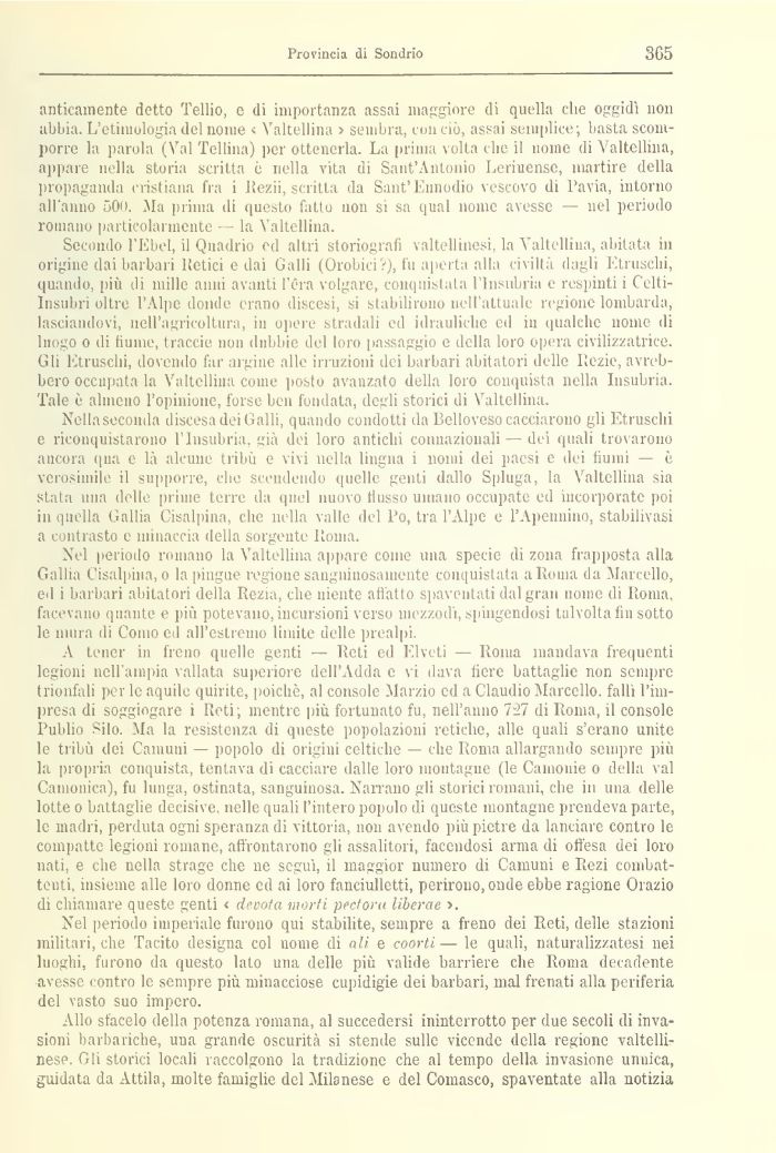 anticamente detto Tallio, e di importanza assai maggiore di quella che oggidì non abbia. L'etimologia del nome < Valtellina > sembra, con ciò, assai semplice; basta scomporre la parola (Val Tellina) per ottenerla. La prima volta che il nome di Valtellina, appare nella storia scritta è nella vita di Sant'Antonio Leriuense, martire della propaganda cristiana fra 1 lìezii, scritta da Sant'Ennodio vescovo di Pavia, intorno all'anno 500. Ma prima di questo fatto non si sa qual nome avesse — nel periodo romano particolarmente — la \ altellina.