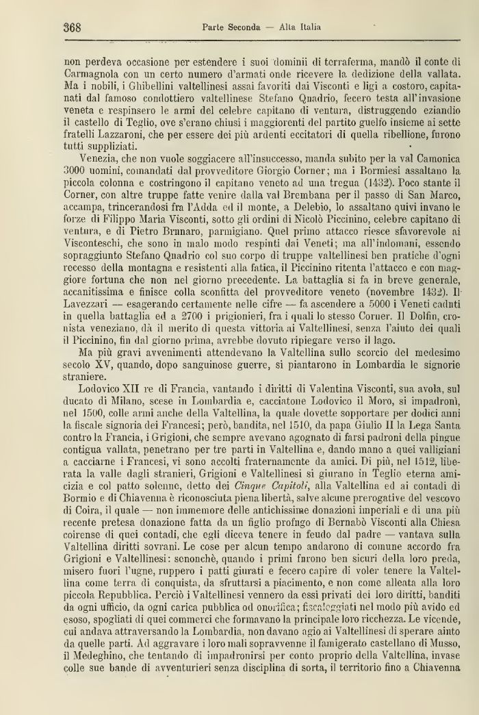 Lodovico XII re di Francia, vantando i diritti di Valentina Visconti, sua avola, sul ducato di Milano, scese in Lombardia e, cacciatone Lodovico il Moro, si impadronì, nel I5(t0, colle anni anche della Valtellina, la quale dovette sopportare per dodici anni la fiscale signoria dei Francesi; però, bandita, nel 1510, da papa Giulio II la Lega Santa contro la Francia, i Grigioni, che sempre avevano agognato di farsi padroni della pingue contigua vallata, penetrano per tre parti in Valtellina e, dando mano a quei valligiani a cacciarne i Francesi, vi sono accolti fraternamente da amici. Di più, nel 1512, liberata la valle dagli stranieri, Grigioni e Valtellinesi si giurano in Teglio eterna amicizia e col patto solenne, detto dei Cinque Cupitoìi, alla Valtellina ed ai contadi di Bormio e di Chiavennaè riconosciuta piena libertà, salve alcune prerogative del vescovo di Coirà, il quale — non immemore delle antichissime donazioni imperiali e di una più recente pretesa donazione fatta da un figlio profugo di Bernabò Visconti alla Chiesa coirense di quei contadi, clic egli diceva tenere in feudo dal padre — vantava sulla Valtellina diritti sovrani. Le cose per alcun tempo andarono di comune accordo fra Grigioni e Valtellinesi: senonchè, quando i primi furono ben sicuri della loro preda, misero fuori l'ugne, ruppero i patti giurati e fecero capire di voler tenere la Valtellina come terra di conquista, da sfruttarsi a piacimento, e non come alleata alla loro piccola Repubblica. Perciò i Valtellinesi vennero da essi privati dei loro diritti, banditi da ogni ufficio, da ogni carica pubblica od onorifica; fiscaleggiati nel modo più avido ed esoso, spogliati di quei commerci che formavano la principale loro ricchezza. Le vicende, cui andava attraversando la Lombardia, non davano agio ai Valtellinesi di sperare, ainto da quelle parti. Ad aggravare i loro mali sopravvenne il famigerato castellano di Musso, il Medeghino, che tentando di impadronirsi per conto proprio della Valtellina, invase colle sue bande di avventurieri senza disciplina di sorta, il territorio fino a Chiavenna