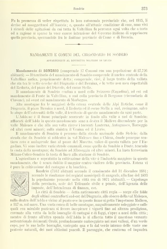 Sondrio Alte montagne fra le rn&ggiwi delta catena centrale delle Alpi Pietiche, come il Disgrazia, il pizzo Bernina a nord, il Bedorta ed il corno Stella a sud, recingono, salvo lo sfogo dell'estremità della valle, il territorio di questo mandamento da ogni parte. L'Adda ile è il fiume principale Scorrente in fondo alla valle a sud di Sondrio; attinenti dell \dda in questo mandamento sono a destra il Mallero discendente per* la valle Malenco e che alla sua volta riceve ì torrenti Lanterna, Antognasco, Torreggio ed altri corsi minori ; sulla sinistra il Venina ed il Livrio. 11 mandamento di Sondrio è percorso dalla strada nazionale dello SteLio; dalla strada che da Sondrio si addentra ni vai Malenco fino a Chiesa, donde proseguo, sentiero erto e malagevole fino al passo del Muretto valico di questa vallata per l'Eli -gadina. \ i sono inoltre varie strade comunali, come quella da Sondrio a Ponte, tenendo la costa della montagna; da Sondrio ad Albofflpfcia ed altre minori. La linea ferroviaria Milano-Colico-Sondrio fa testa di linea alla stazione di Sondrio. L'agricoltura e sopratutto la coltivazione della vite è l'industria maggiore in questo mandamento, che è senza dubbio il maggior centro vinifero della provincia. Estesa vi è pure la coltivazione del castagno e la boschiva. Sondrio (7342 abitanti secondo il censimento del 31 dicembre ISSI; secondo le risultanze dei registri municipali di anagrafe, alla fine del 1893 la popolazione presente nella città era di 9071 abitanti). — Capoluogo della provincia, sede del Tribunale civile e penale, dell'Agenzia delle imposte, dell'Intendenza di finanza, ecc. La città di Sondrio — detta anticamente città regia — sorge alle falde degli ultimi contrafforti sud-est del Disgrazia, allo sbocco della vai Malenco, sulla destra dell' Adda e vicino al pulito ove in questo fiume si getta l'impetuoso Mallero, a 347 m. sul mare. Una vasta conca di belle montagne, magnificamente soleggiate e sulle quali con mirabile pazienza si fecero inerpicare ì vigneti fino ad altezza prodigiosa, coronate alla vetta da belle boscaglie di castagni e di faggi, s'apre a nord della città ; mentre di fronte all'altra sponda dell'Adda le si affacci! tutto il maestoso versante settentrionale dei monti Orobi, profondamente ombreggiato nei suoi valloni, d'un verde cupo, per le sue belle boscaglie, variegato qua e là dal verde intenso delle vaste sue praterie naturali, dei suoi altissimi pascoli. Il paesaggio, che contorna ed inquadra ![]() |