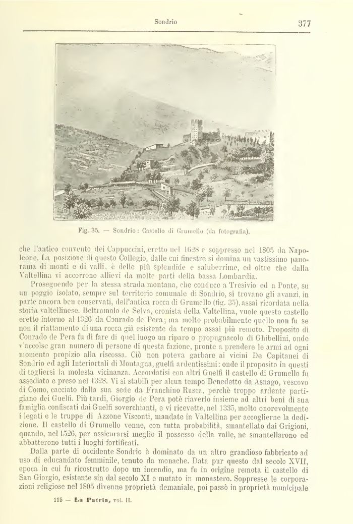 Proseguendo per la stessa strada montana, clic conduce a Tresivio ed a Ponte, su un poggio isolato, sempre sul territorio comunale di Sondrio, si trovano gli avanzi, in parte ancora ben conservati, dell'antica rocca dì Grumello (fig. 35), assai ricordata nella storia valtellinese. Beltramolo de Selva, cronista della Valtellina, vuole questo castello eretto intorno al 1326 da Conrado de Pera; ma molto probabilmente quello non fu se non il riattamento di una rocca già esistente da tempo assai più remoto. Proposito di Conrado de Pera fu di fare di quel luogo un riparo o propugnacolo di Ghibellini, onde v'accolse gran numero di persone di questa fazione, pronte a prendere le armi ad ogni momento propizio alla riscossa. Ciò non poteva garbare ai vicini De Capitanei di Sondrio ed agli Interiortali di Montagna, guelfi ardentissimi: onde il proposito in questi di togliersi la molesta vicinanza, Accordatisi con altri Guelfi il castello di Grumello fu assediato e preso nel 1328. Vi si stabilì per alcun tempo Benedetto da Asnago, vescovo di Como, cacciato dalla sua sede da Franchino Rusca, perchè troppo ardente partigiano dei Guelfi. Più tardi, Giorgio de Pera potè riaverlo insieme ad altri beni di sua famiglia confiscati dai Guelfi soverchinoti, e vi ricevette, nel 1335, molto onorevolmente i legati e le truppe di Azzone Visconti, mandate in Valtellina per accoglierne la dedizione. Il castello di Grumello venne, con tutta probabilità, smantellato dai Grigìoni, quando, nel 1526, per assicurarsi meglio il possesso della valle, ne smantellarono ed abbatterono tutti i luoghi fortificati.