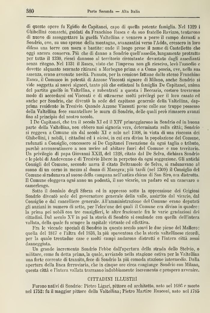 di queste opere fu Egidio de Capitanei, capo di quella potente famiglia. Nel 1329 i Ghibellini comaschi, guidati da Eranchino Rusca e da suo fratello Ha vizzo, tentarono di nuovo di assoggettare la guelfa Valtellina e vennero a porre il campo davanti a Sondrio, ove, su uno sprone della montagna, avanzantisi verso l'Adda, eressero in loro difesa una torre con mura e bastite: onde il luogo prese il nome di Castelletto che oggi ancora conserva. Più che di danno a Sondrio quell'assedio, lungamente protratto per tutto il 1330, riesci dannoso al territorio circostante devastato dagli assedianti senza ritegno. Nel 1331 il Rusca, visto che l'impresa non gli riesciva, levò l'assedio e dovette alquanto scornato ritirarsi a Morbegno prima e a Como poscia, ove, nella sua assenza, erano avvenute novità. Passato, per la cessione fattane dallo stesso Franchino Rusca, il Comasco in potestà di Azzone Visconti signore di Milano, anche Sondrio si vide soggetta ai nuovi signori, tanto più che estiutasi la famiglia De Capitanei, anima del partito guelfo in Valtellina, e subentrati a questa i Beccaria, costoro trovarono modo di accordarsi coi Visconti e di ottenerne molti privilegi per il loro casato ed anche per Sondrio, che diventò la sede del capitano generale della Valtellina, dapprima residente in Tresivio. Quando Azzone Visconti prese colle sue truppe possesso della Valtellina fece smantellare le mura di Sondrio, delle quali però rimasero avanzi lino al principio del nostro secolo.