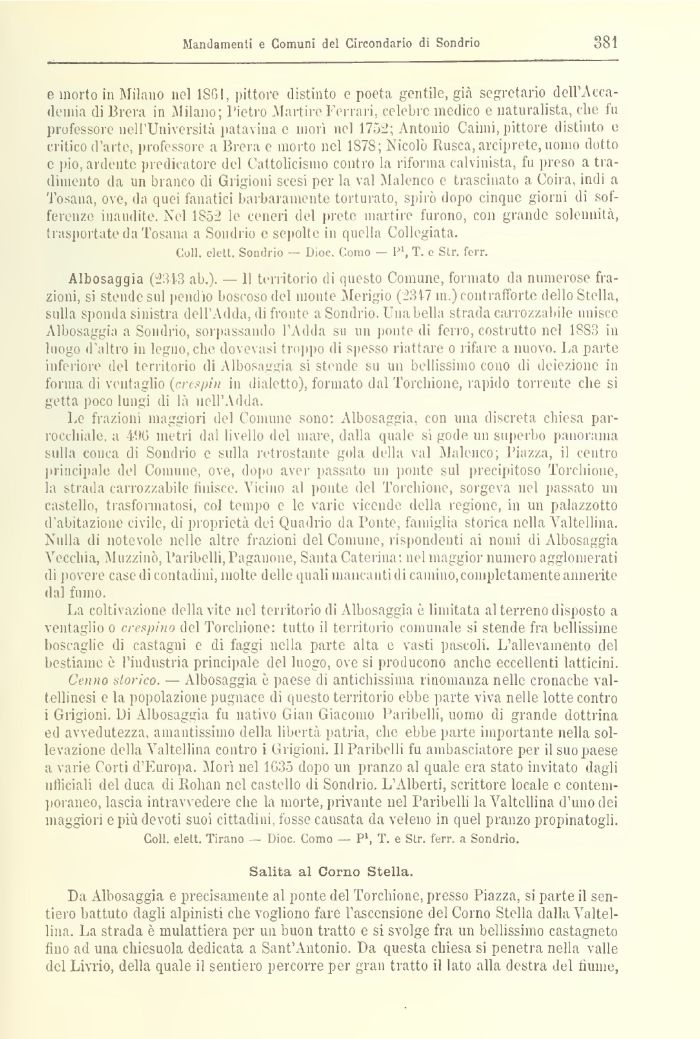 Cenno storico. — Albosaggia è paese di antichissima rinomanza nelle cronache valtellinesi e la popolazione pugnace di questo territorio ebbe parte viva nelle lotte contro i Grigioni. Di Albosaggia fu nati\o Gian Giacomo Paribelli, uomo di grande dottrina ed avvedutezza, amantissimo della libertà patria, che ebbe parte importante nella sollevazione della Valtellina contro i Grigioni. Il Paribelli fu ambasciatore per il suo paese a varie Corti d'Europa. Morì nel 1G35 dopo un pranzo al quale era stato invitato dagli ufficiali del duca di Rohan nel castello di Sondrio. L'Alberti, scrittore locale e contemporaneo, lascia intravvedere che la morte, privante nel Paribelli la Valtellina d'uno dei maggiori e più devoti suoi cittadini fosse causata da veleno in quel pranzo propinatogli.