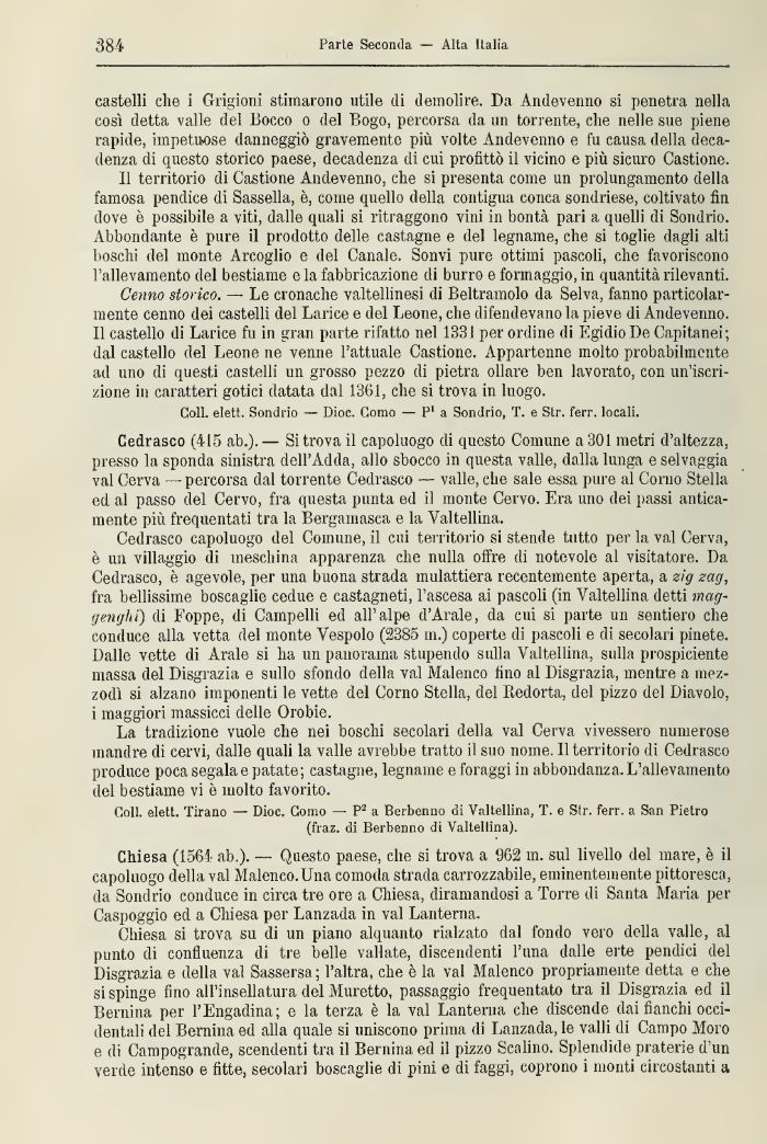 Cedrasco (415 ab.). — Si trova il capoluogo di questo Comune a 301 metri d'altezza, presso la sponda sinistra dell'Adda, allo sbocco in questa valle, dalla lunga e selvaggia vai Cerva — percorsa dal torrente Cedrasco — valle, che sale essa pure al Corno Stella ed al passo del Cervo, fra questa punta ed il monte Cervo. Era uno dei passi anticamente più frequentati tra la Bergamasca e la Valtellina.