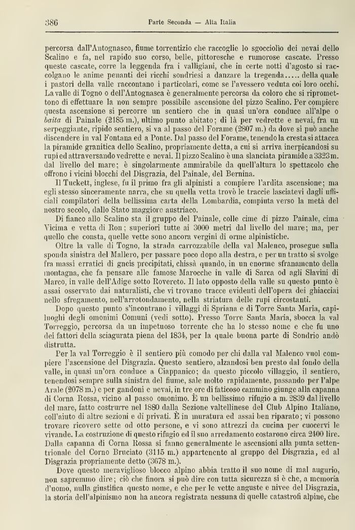 Dove questo meraviglioso blocco alpino abbia tratto il suo nome di mal augurio, noil sapremmo dire; ciò che finora si può dire con tutta sicurezza si è che, a memoria d'uomo, nulla giustifica questo nome, e che per le vette anguste e nivee del Disgrazia, la storia dell'alpinismo 11011 ha ancora registrata nessuna di quelle catastrofi alpine, che
