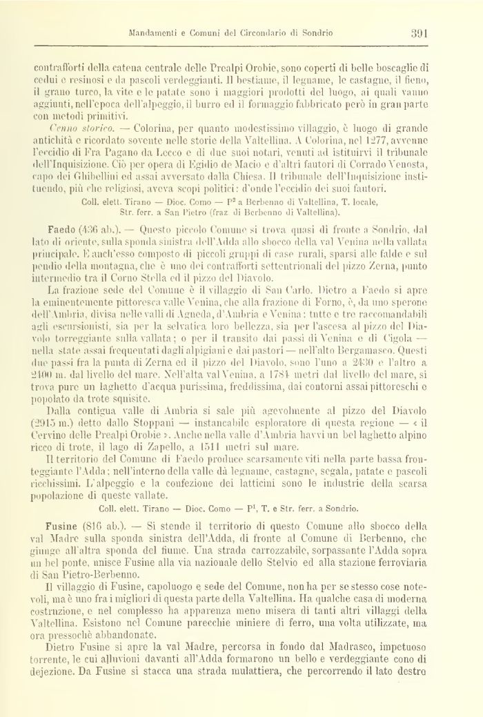 Colf elett. Tirano — Dioc. Como — P2 a Hcrbenno dì Valtellina, T. locale, Str. ferr. a San Pietro (fraz di Hcrbenno di Valtellina), Faedo (4:1(5 ab.). - Questo piccolo Comune si trova quasi dì fronte a Sondrio, dal I rto di oriente, sulla sponda sinistra dell Vida allo sbocco della vai Veiima nella vallata principale. 13 anch'esso composto di piccoli gruppi di case rurali, sparsi alle falde e sul pendio della montagna, che è uno dei contrafforti settentrionali del pizzo Zerna, punto intermedio tra il Corno Stella ed d pizzo del Diavolo. La frazione sede del Comune è il villaggio di San Carlo. Dietro a l'aedo si apre la eminentemente pittoresca valle Yenina, che alla frazione di Forno, è, da uno sperone dell' Vuibria, divisa nelle \ adi di Agneda, d'Anilina e Yenina : tutte e tre raccomandabili agli escursionisti sia per la seh atira loro bellezza, sia por l'ascesa al pizzo del Diavolo torreggiante sulla vallata ; o per il transito dai passi di Veni® e dì Cigola nella state assai frequentati dagli alpigiani e dai pastori — nell'alto Bergamasco. Questi due passi fra la punta di Zerna ed il pizzo del Diavolo, sono l'uno a 24MO e l'altro a. 2400 ni. dal livello del mare. Nell'alta vai Yenina. a 1784 metri dal livello del mare, si trova pure un laghetto d'acqua purissima, freddissima, dai contorni assai pittoreschi e popolato da trote squisite. Dalla contigua valle di Ambria si sale più agevolmente al pizzo del Diavolo (2915 in.) detto dallo Stoppani — instancabile esploratore di questa regione — < il Cervino delle Prealpi Orobie Anche nella valle, d Vinbria liawi un bel laghetto alpino ricco di trote, il lago di Zapello, a 1511 metri sul mare. Il territorio del Connine ili l'aedo produce scarsamente viti nella parte bassa fron-teggiante, l'Adda; nell'interno della valle da legname, castagne, segala, patate e pascoli ricchissimi. L'alpeggio e la confezione dei latticini sono le industrie delia scarsa popolazione di queste vallate. Coli, elett. Tirano — Dioc. Como — P\ T. e Str. ferr. a Sondrio. Fusine (810 ab.). — Si stende il territorio di questo Comune allo sbocco della vai Madre sulla sponda sinistra dell'Adda, di fronte al Comune di Berbenno, che giungo all'altra sponda del fiume. Una strada carrozzabile, sorpassante l'Adda sopra un bel ponte, unisce Fusine alla via nazionale dello Stelvio ed alla stazione ferroviaria di San Pietro-Berbeuno. Il villaggio di Fusine, capoluogo e sede del Comune, non ha per se stesso cose notevoli, ma è uno fra i migliori di questa parte della Valtellina. Ha qualche casa di moderna costruzione, e nel complesso ha apparenza meno misera di tanti altri villaggi della Valtellina, Esistono nel Connine parecchie miniere di ferro, una volta utilizzate, ma ora pressoché abbandonate. Dietro Fusine si apre la vai Madre, percorsa in fondo dal Madrasco, impetuoso torrente, le cui alluvioni davanti all'Adda formarono un bello e verdeggiante cono di dejezione. Da Fusine si stacca una strada mulattiera, che percorrendo il lato destro ![]() |