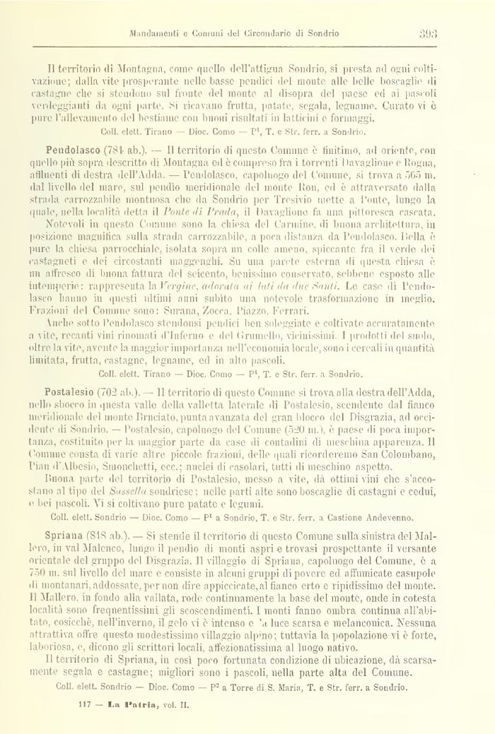 Pendolasco (781- ab.). — Il territorio di questo Comune è linitimo, ad oriente, con quello più sopra descritto di Montagna ed è compreso fra i torrenti I lavagliene e Rogna, affluenti di destra dell'Adda. — l'eudolasco, capoluogo del Comune, si trova a 5G5 m. dal livello del mare, sul pendìo meridionale del monte lìon, ed è attraversato dalla strada carrozzabile montuosa che da Sondrio per4 Tresivio mette a l'onte, lungo la quale, nella località detta il Ponte ili l'rada, il lavagliene fa una pittoresca cascata.