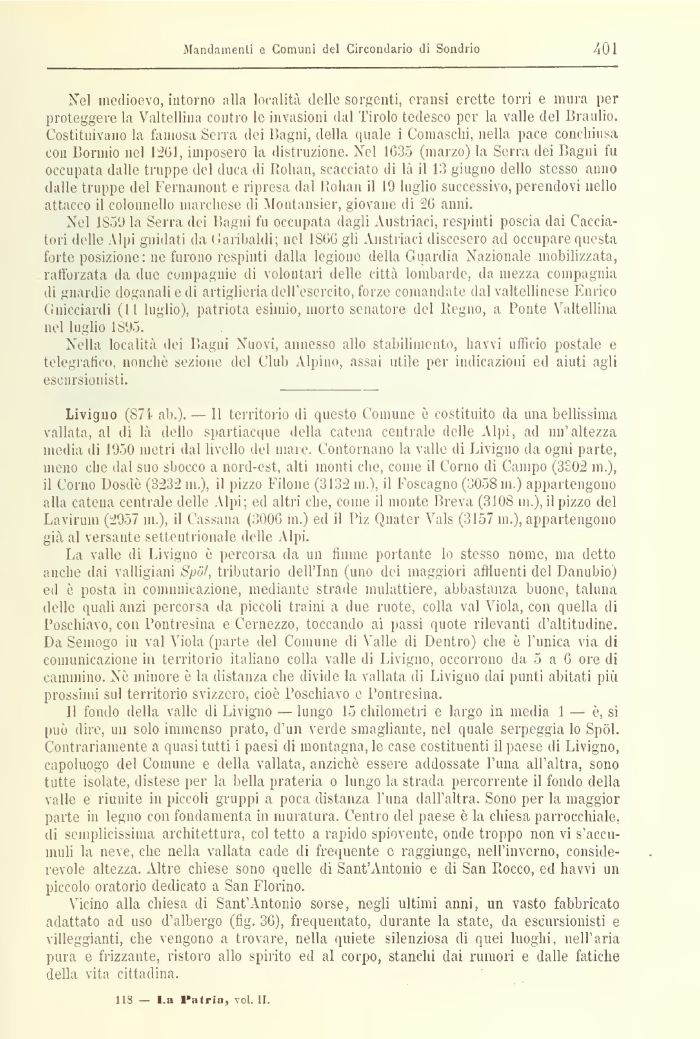 Liviguo (871- ab.). — Il territorio di questo Comune è costituito da una bellissima vallata, al di là dello spartiacque della catena centrale delle Alpi, ad un'altezza media di 1950 metri dal livello del mare. Contornano la valle di Livigno da ogni parte, meno che dal suo sbocco a nord-est, alti monti che, come il Corno di Campo (3S02 ni.), il Corno Bosdè (3232 ni.), il pizzo Filone (3132 in.), il Foscagno (3058 in.) appartengono alla catena centrale delle Alpi; ed altri che, come il monte Hreva (3108 in.), il pizzo del La vi rum (2957 ni.), il Cassami (3006 m.) ed il Pìz Qnater Vals (3157 in.), appartengono già al versante settentrionale delle Alpi.