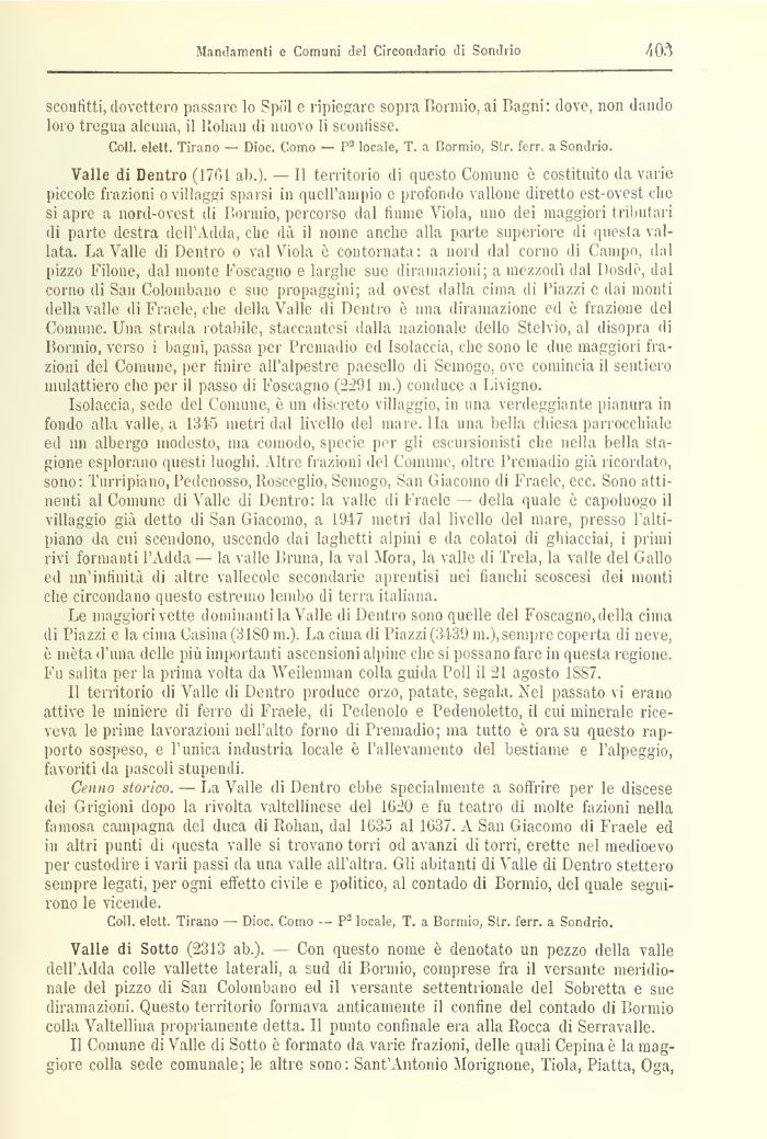 Isolacela, sede del Comune, è un discreto villaggio, in una verdeggiante pianura in fondo alla valle, a 1345 metri dal livello del mare. Ila una bella chiesa parrocchiale ed un albergo modesto, ma comodo, specie per gli escursionisti che nella bella stagione esplorano questi luoghi. Altre frazioni del Connine, oltre Prcniadio già ricordato, sono: Turni pia no, Pedenosso, llosceglio, Semogo, San Giacomo di Fraele, ecc. Sono attinenti al Comune di Valle di Dentro: la valle di Fraele — della quale è capoluogo il villaggio già detto di San Giacomo, a 1917 metri dal livello del mare, presso l'altipiano da cui scendono, uscendo dai laghetti alpini e da colatoi di ghiacciai, i primi rivi formanti l'Adda ¦— la valle Bruna, la vai Mora, la valle di Trela, la valle del Gallo ed un'infinità di altre vallecole secondarie aprentisi nei fianchi scoscesi dei monti che circondano questo estremo lembo dì terra italiana.