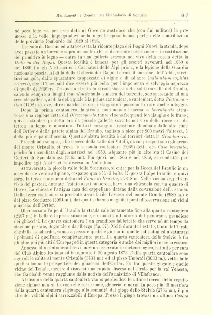 Uscendo da Bormio ed attraversata la ridente plaga dei Bagni Nuovi, la strada, dopo aver passato un burrone sopra un ponte di ferro di recente costruzione—iu sostituzione del primitivo in legno — entra in una galleria scavata nel vivo della roccia detta la Galleria dei Bagni. Questa località è famosa per gli scontri avvenuti, nel 1859 e nel 1806, fra gli Austriaci ed i Cacciatori delle Alpi prima, e la legione della Guardia nazionale poscia. Al di là della Galleria dei Magni trovasi il burrone dell'Adda, strettissima gola, dalle spaccature tappezzate di alghe e dì adianto (udianthnm capiMus veneri*), che il Theobald dice essere più bella per 1 imponenza e selvaggia asprezza dì quella di Pfatfers. Da questa stretta la strada sbocca nella solitaria valle del Braulio, salendo sempre a lunghi tourni'juds sulla sinistra del torrente, sottopassando ad una seconda galleria, al di la della quale è la prima cantoniera, o cantoniera detta Pia ti amenti tio (1702m.). ove, oltre qualche ristoro, i viaggiatori possono trovare anche alloggio.