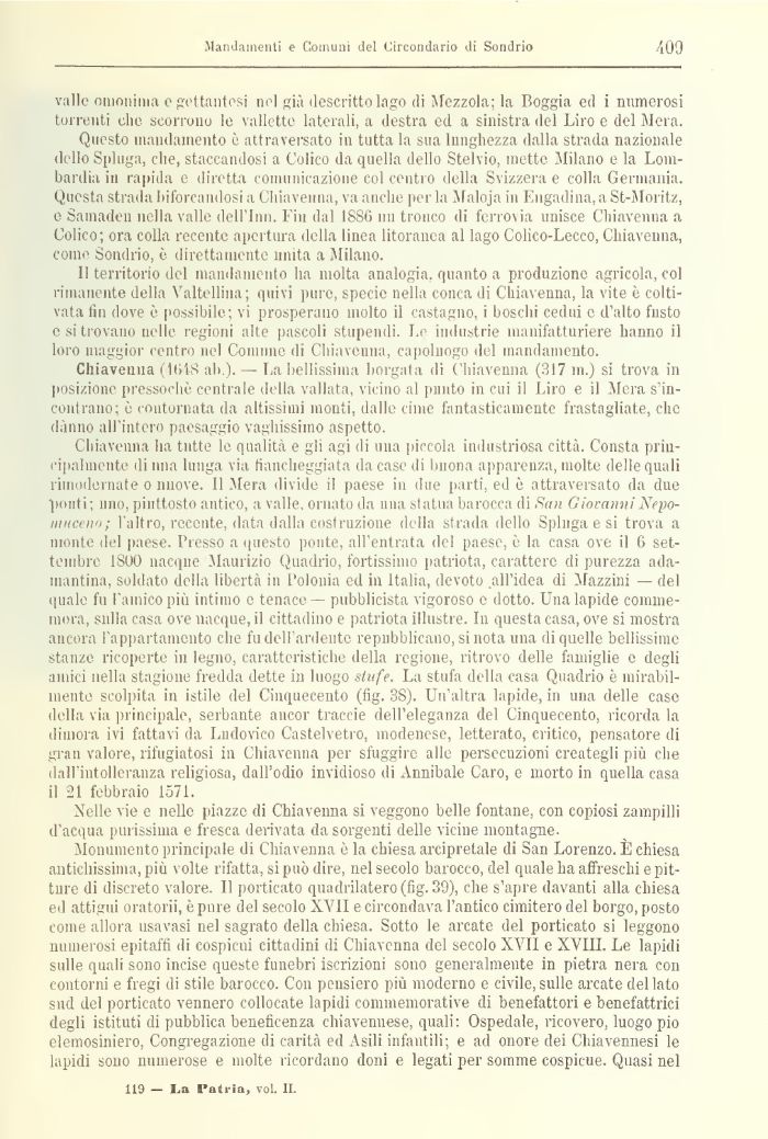 Chiavenna ha tutte le qualità e gli agi di una piccola industriosa città. Consta principalmente di ima lunga via fiancheggiata da case di buona apparenza, molte delle quali rimodernai e 0 nuove. Il Mera divide il paese in due parti, ed è attraversato da due ponti; 11110, piuttosto antico, a valle, ornato da una statua barocca di San GiovanniNepo-iintceno; 1 altro, recente, data dalla costruzione della strada dello Spinga e si trova a monte del paese. Presso a questo ponte, all'entrata del paese, è la casa ove il G settembre 1SU0 nacque Maurizio Quadrio, fortissimo patriota, carattere di purezza adamantina, soldato della libertà in Polonia ed in Italia, devoto all'idea di Mazzini — del limile fu l'amico più intimo e tenace — pubblicista vigoroso e dotto. Una lapide commemora, sulla casa ove nacque, il cittadino e patriota illustre. In questa casa, ove si mostra ancora l'appartamento che fu dell'ardente repubblicano, si nota una dì quelle bellissime stanze ricoperte in legno, caratteristiche della regione, ritrovo delle famiglie e degli amici nella stagione fredda dette in luogo stufe. La stufa della casa Quadrio è mirabilmente scolpita in istile del Cinquecento (fig. 3S). Un'altra lapide, in una delle case della via principale, serbante ancor traccie dell'eleganza del Cinquecento, ricorda la dimora ivi fattavi da Ludovico Castelvetro, modenese, letterato, critico, pensatore di gran valore, rifugiatosi in Chiavenna per sfuggire alle persecuzioni creategli più che dall'intolleranza religiosa, dall'odio invidioso di Annibale Caro, e morto in quella casa il 21 febbraio 1571.