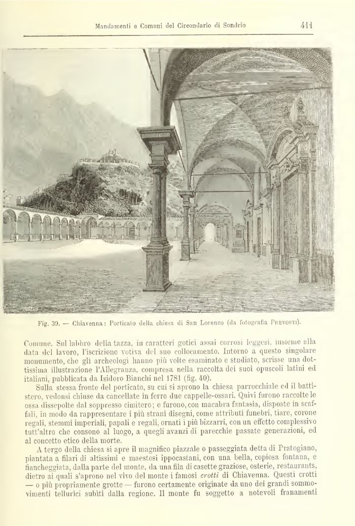 A tergo della chiesa si apre il magnifico piazzale o passeggiata detta di Pratogiano, piantata a filari di altissimi e maestosi ippocastani, con una bella, copiosa fontana, e fiancheggiata, dalla parte del monte, da una fila di casette graziose, osterie, restauralits, dietro ai quali s'aprono nel vivo del monte i famosi erotti di Chiavenna. Questi erotti — o più propriamente grotte — furono certamente originate da uno dei grandi sommovimenti tellurici subiti dalla regione. Il monte fu soggetto a notevoli franamenti