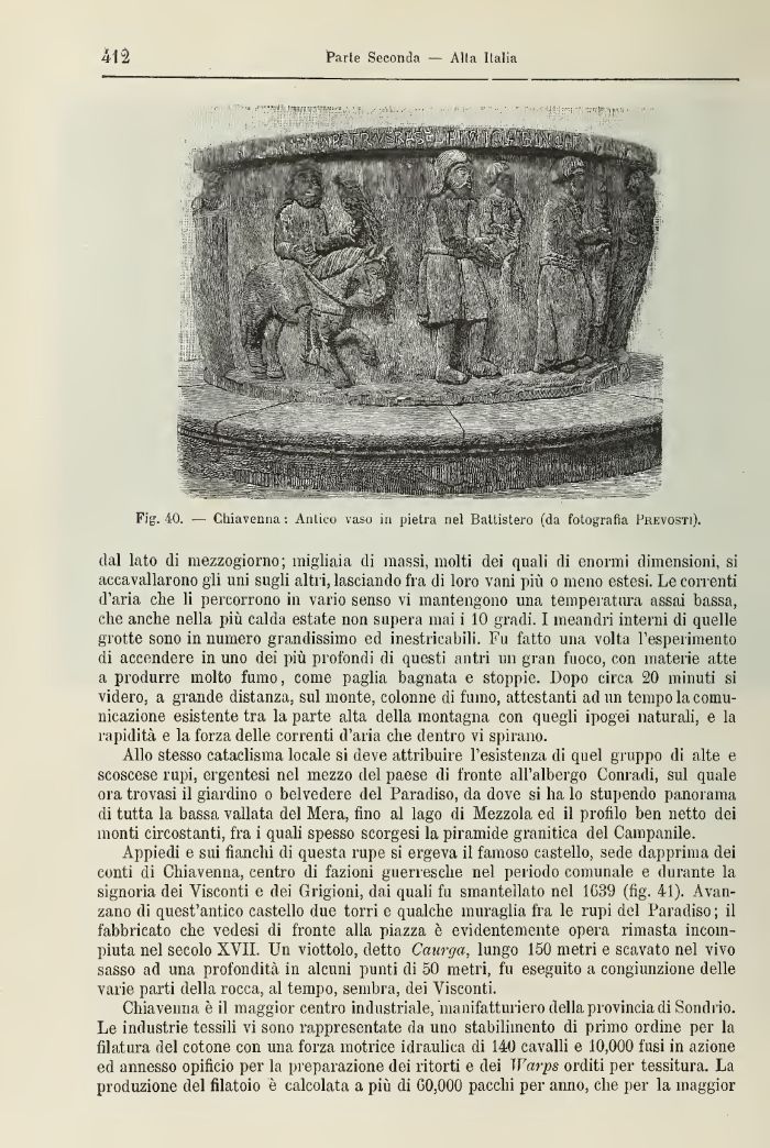 Appiedi e sui fianchi di questa rupe si ergeva il famoso castello, sede dapprima dei conti di Chiavenna, centro di fazioni guerresche nel periodo comunale e durante la signoria dei Visconti e dei Grigioni, dai quali fu smantellato nel 1G39 (fig. 41). Avanzano di quest'antico castello due torri e qualche muraglia fra le rupi del Paradiso ; il fabbricato che vedesi di fronte alla piazza è evidentemente opera rimasta incompiuta nel secolo XVII Un viottolo, detto Caurga, lungo 150 metri e scavato nel vivo sasso ad una profondità ili alcuni punti di 50 metri, fu eseguito a congiunzione delle varie parti della rocca, al tempo, sembra, dei Visconti.