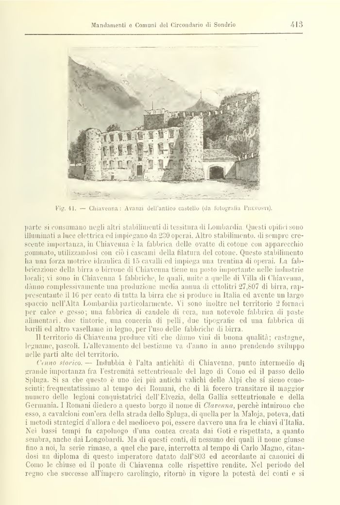 Cenno storico. — Indubbia è l'alta antichità di Chiavenna, punto intermedio di grande importanza fra l'estremità settentrionale del lago di Como ed il passo dello Spinga. Si sa che questo è uno dei più antichi valichi delle Alpi che si sieno conosciuti: frequentatissimo al tempo dei Romani, che di là fecero transitare il maggior numero delle legioni conquistatrici dell'Elvezia, della Gallia settentrionale e della Germania. I Romani diedero a questo borgo il nome di Clavenna, perchè intuirono che esso, a cavalcioni com'era della strada dello Spluga, di quella per la Maloja, poteva, dati i metodi strategici d'allora e del medioevo poi, essere davvero una fra le chiavi d'Italia. Nei bassi tempi fu capoluogo d'una contea creata dai Goti e rispettata, a quanto sembra, anche dai Longobardi. Ma di questi conti, di nessuno dei quali il nomo giunse tino a noi, la serie rimase, a quel clic pare, interrotta al tempo di Carlo Magno, citandosi 1111 diploma di questo imperatore datato dall'801 ed accordante ai canonici di Como le chiuse ed il ponte di Chiavenna colle rispettive rendite. Nel periodo del regno che successe all'impero carolingio, ritornò iu vigore la potestà dei conti e si