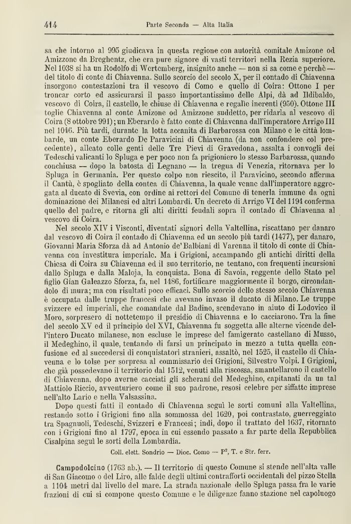 sa die intorno al 905 giudicava in questa regione con autorità comitale Amicone od Amizzone da Breghentz, die era pure signore di vasti territori nella Rezia superiore. Nel 1038 si ha un Rodolfo di Wertemherg. insignito anche — non si sa come e perchè — del titolo di conte di Chiavenna. Sullo scorcio del secolo X, per il contado di Chiavenna insorgono contestazioni tra il vescovo di Como e quello di Coirà: Ottone I per troncar corto ed assicurarsi il passo importantissimo delle Alpi, dà ad Bdibaldo, vescovo di Coirà, il castello, le chiuse di Chiavenna e regalie inerenti (950). Ottone XII toglie Chiavenna al conte Amizone od Amizzone suddetto, per ridarla al vescovo di Coirà (8 ottobre 991) ; un Eberanlo è fatto conte di Chiavenna dall'imperatore Arrigo III nel 1046. Più tardi, durante la lotta accanita di Barbarossa con Milano e le città lombarde, un conte Eberanlo De Paravicini di Chiavenna (da non confondere col precedente), alleato colle genti delle Tre Pievi di Gravedona, assalta i convogli dei Tedeschi valicanti lo Spluga e per poco non fa prigioniero lo stesso Barbarossa, quando conchiusa — dopo la batosta di Legnano — la tregua di Venezia, ritornava per lo Spluga in Germania. Per questo colpo non riescito, il Paravicino, secondo afferma il Cantù, è spogliato della contea di Chiavenna, la quale venne dall'imperatore aggregata al ducato di Svevia, con ordine ai rettori del Comune di tenerla immune da ogni dominazione dei Milanesi ed altri Lombardi, Un decreto di Arrigo VI del 1191 conferma quello del padre, e ritorna gli alti diritti feudali sopra il contado di Chiavenna al vescovo di Coirà.