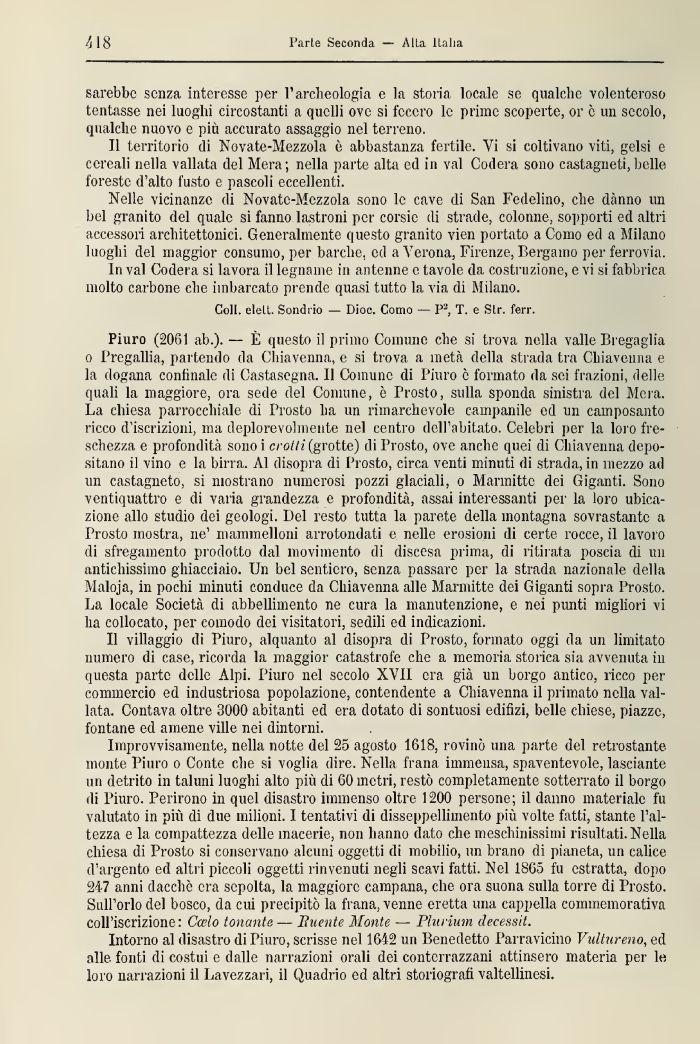 Il villaggio di Piuro, alquanto al disopra di Prosto, formato oggi da un limitato numero di case, ricorda la maggior catastrofe che a memoria storica sia avvenuta in questa parte delle Alpi. Piuro nel secolo XVII era già un borgo antico, ricco per commercio ed industriosa popolazione, contendente a Chiavenna il primato nella vallata. Contava oltre 3000 abitanti ed era dotato di sontuosi edifizi, belle chiese, piazze, fontane ed amene ville nei dintorni.