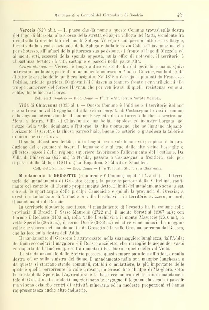 Vcrceja (829 ab.). - TI paese die dà nome a questo Comune trovasi sulla destra del lago di Mezzola, allo sbocco della stretta ed aspra valletta dei Ratti, scendente fra i contrn(l'orti occidentali del monte Spluga. \ ercoja è un piccolo pittoresco villaggio, toccato dalla strada nazionale dello Spluga e dalla ferrovia Colico-Chìavenna: ma die per sè stesso, ali infuori della pittoresca sua posizione, di fronte al lago di Mezzola ed ai monti erti, scoscesi della sponda opposta, nulla oltre di notevole. Il territorio è abbastanza fertile: dà \iti, castagne e pascoli nella parte alta.