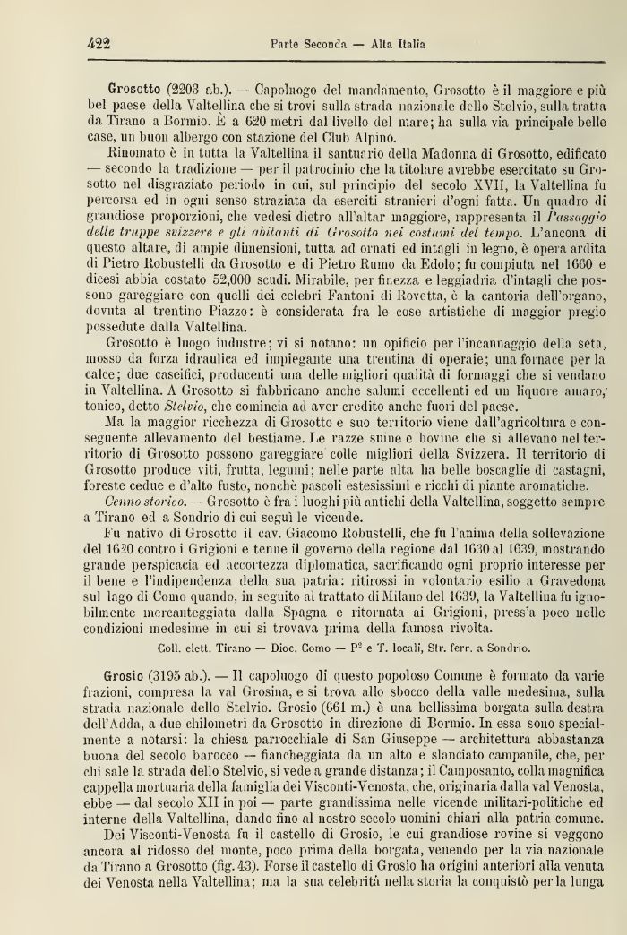 Grosio (3195 ab.). — Il capoluogo di questo popoloso Comune è formato da varie frazioni, compresa la vai Grosina, e si trova allo sbocco della valle medesima, sulla strada nazionale dello Stelvio. Grosio (661 ni.) è una bellissima borgata sulla destra dell'Adda, a due chilometri da Grosotto in direzione di Bormio. In essa sono specialmente a notarsi: la chiesa parrocchiale di San Giuseppe — architettura abbastanza buona del secolo barocco fiancheggiata da un alto e slanciato campanile, che, per chi sale la strada dello Stelvio, si vede a grande distanza; il Camposanto, colla magnifica cappella mortuaria della famiglia dei Visconti-Venosta, che, originaria dalla vai Venosta, ebbe — dal secolo XII in poi — parte grandissima nelle vicende militari-politiche ed interne della Valtellina, dando fino al nostro secolo uomini chiari alla patria comune.