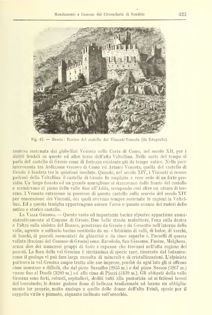 contesa sostenuta dai ghibellini Venosta colla Curia di Como, nel secolo XII, per 1 diritti feudali su queste ed altre terrò dell'alta Valtellina. Nelle carte del tempo si parla del castello di Grosio come di fortezza esistente già da tempo antico. Nella pace intervenuta tra Ardizzone vescovo di Como ed Artuico Venosta, quella del castello di Grosio è lasciata tra le quistioni insolute. Quando, nel secolo XIV, 1 Visconti si resero padroni della Valtellina il castello di Grosio fu ampliato e reso sede di un forte presidio. Un largo fossato ed 1111 grande ìiiiiraglione si staccavano dalla fronte del castello e scendevano al piano della valle tino all'Adda, occupando così oltre un ettaro di terreno. 1 Venosta entrarono in possesso di questo castello sullo scorcio del secolo XIV per concessione dei Visconti, dei quali avevano sempre sostenute le ragioni in Valtellina. Ed a questa famiglia appartengono ancora l'area e quanto avanza dei ruderi dello antico e storico castello.