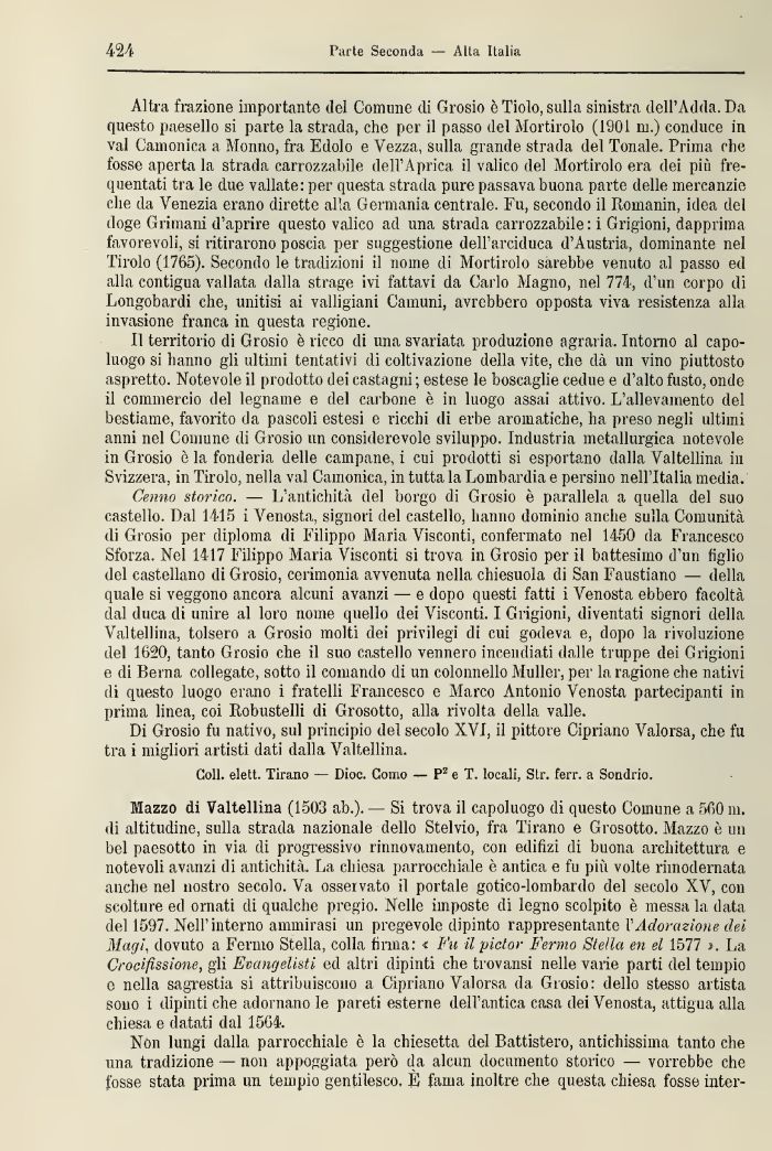 Mazzo di Valtellina (1503 ab.). — Si trova il capoluogo (li questo Comune a 560 ni. di altitudine, sulla strada nazionale dello Stelvio, fra Tirano e Grosotto. Mazzo è un bel paesotto in via di progressivo rinnovamento, con edifizt di buona architettura e notevoli avanzi di antichità. La chiesa parrocchiale è antica e fu più volte rimodernata anche nel nostro secolo. Va osservato il portale gotico-lombardo del secolo XV, con scolture ed ornati di qualche pregio. Nelle imposte di legno scolpito è messa la data del 1597. Nell'interno ammirasi un pregevole dipinto rappresentante VAdorazione del Magi, dovuto a Fermo Stella, colla firma: < Fu il pictor Fermo Stella en el 1577 », La Crocifissione, gli Evangelisti ed altri dipinti che trovansi nelle varie parti del tempio o nella sagrestia si attribuiscono a Cipriano Valorsa da Grosio: dello stesso artista souo i dipinti che adornano le pareti esterne dell'antica casa dei Venosta, attigua alla chiesa e datati dal 15(54.