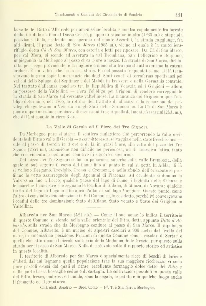 la valle del Bitte d'Albarello per amenissime località, s'innalza rapidamente fra foreste d'abeti e di larici fino al Dosso Gerico, gruppo di capanne in alta (1230 m.) e stupenda posizione. Di là, risalendo uno sperone del monte A/zarini, la strada raggiunge, fra alti dirupi, d passo detto di San Marco (l'JSó ni.), vicino al quale è la cantoniera-rifugio, detta Cà di San Marco, con osteria e letti per riposare. Da Cà di San Marco, per vai Mora, si scende ad Averara in vai Breinbana, bau Pellegrino e Bergamo, impiegando da Morbegno al passo circa 5 ore e mezzo. La strada di San Marco, dichiarata per legge provinciale, è la migliore e meno alta fra quante attraversano la catena orobica. l'I nn valico che ha la sua storia. Fu nel passato frequentatissimo. Di là transitavano in gran copia le mercanzie che dagli Stati veneti di terraferma spedivansi pei valichi dello Spinga, del Septinier e del Maloja in Isvizzera e nella Germania centrale. Nel trattato d'alleanza concluso tra la Repubblica di Venezia ed i Grigioni — allora in possesso della Valtellina c'era l'obbligo pei Grigioni di rendere carreggiabile la strada di San Marco sul versante valtellinese. l a mancanza dei (