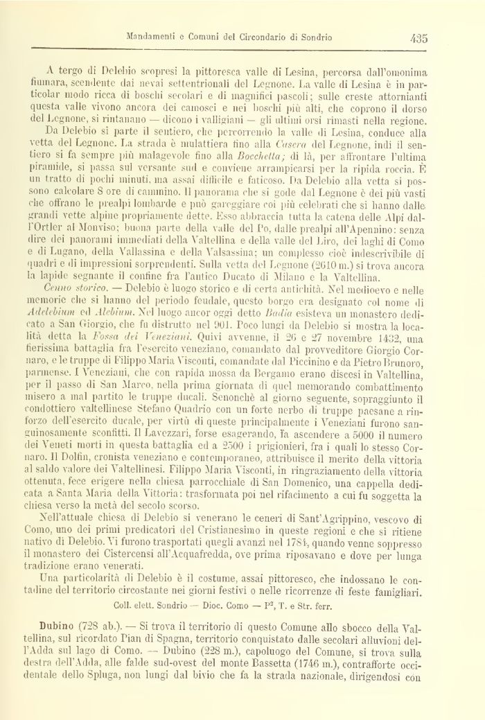 Cenno storico. — Delebio è luogo storico e di certa antichità. Nel medioevo e nelle memorie che si hanno del periodo feudale, questo borgo era designato col nome di Adelehium ed Alebium. Nel luogo ancor oggi detto Badia esisteva un monastero dedicato a San Giorgio, che fu distrutto nel 001. Poco lungi da Delebio si mostrala località detta la Fossa dei Veneziani. Quivi avvenne, il 26 e 27 novembre 1432, una fierissima battaglia fra l'esercito veneziano, comandato dal provveditore Giorgio Cor-naro, e le truppe di Filippo Maria Visconti, comandate dal Piccinino e da Pietro Brunoro, parmense. I Veneziani, che con rapida mossa da Bergamo erano discesi in Valtellina, per il passo di San .Marco, nella prima giornata di quel memorando combattimento misero a mal partito le truppe ducali. Senonchè al giorno seguente, sopraggiunto il condottiero valtellinese Stefano Quadrio con un forte nerbo di truppe paesane a rinforzo dell'esercito ducale, per virtù di queste principalmente i Veneziani furono sanguinosamente sconfitti. Il Lavezzari, forse esagerando, fa ascendere a 5000 il numero dei Veneti morti in questa battaglia ed a 2500 i prigionieri, fra i quali lo stesso Cornare. 11 Dolfin, cronista veneziano e contemporaneo, attribuisce il merito della vittoria al saldo valore dei Valtellinesi. Filippo Maria Visconti, in ringraziamento della vittoria ottenuta, fece erigere nella chiesa parrocchiale di San Domenico, una cappella dedicata a Santa Maria della Vittoria: trasformata poi nel rifacimento a cui fu soggetta la chiesa verso la metà del secolo scorso.
