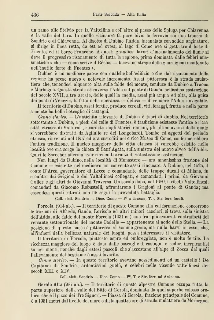 Dubino è un mediocre paese con qualche bell'edifizio e che dal risanamento della regione ha preso nuovo e notevole incremento. Assai pittoresca è la strada mulattiera che, tenendosi alquanto alta sulle falde del monte, conduce da Dubino a Traona e Morbegno. Questa strada attraversa l'Adda sul ponte di Banda, bellissima costruzione del secolo XVII, a tre arcate, dello quali la media, assai più ampia ed alta, alla guisa dei ponti diYenezia, fu fatta nella speranza — delusa — di rendere l'Adda navigabile.
