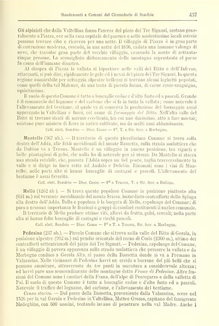 Gli alpinisti che dalla Valtellina fanno l'ascesa del pizzo dei Tre Signori, sostano generalmente a Piazza, ove nella casa ospitale del parroco o nelle modestissime locali osterie possono trovare cibo e ricovero pev unanottc.il villaggio di Piazza è in gran parte di costruzione moderna, essendo, in una notte del 1S3G, caduta una immane valanga di neve, che travolse gran parte del vecchio villaggio, causando la morte di settanta-einque persone. Lo sconsigliato disboscamento della montagna soprastante al paese fu causa dell'immane disastro.