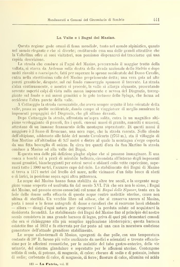 E questa una delle più deliziose plaghe alpine che si possano immaginare. E una conca a boschi ed a prati di mirabile bellezza, circondata all'intorno dagli imponenti unissi granitici, biancheggianti per estesi nevai e sfidanti colle vette capricciose, superanti tutte i 3000 metri, l'azzurro cupo del cielo. Lo stabilimento dei Bagni di Masino si trova a 1171 metri dal livello del mare, nelle vicinanze d'un folto bosco di abeti e di larici, m posizione sopra ogni altra pittoresca.
