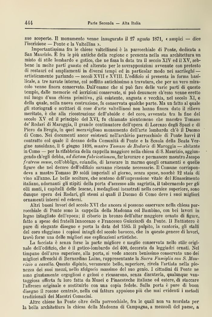 Importantissima fra le chiese valtellinesi e la parrocchiale di Ponte, dedicata a San Maurizio. E fra le più antiche della regione e presenta nella sua architettura un misto di stile lombardo e gotico, che ne fissa la data tra il secolo XIV ed il XV, sebbene in molte parti guasto ed alterato per le sovrapposizioni avvenute con pretesto di restauri ed ampliamenti in diversi tempi ed in particolar modo nei sacrileghi — artisticamente parlando — secoli XVII e XVIII. L'edifizio si presenta in forma basilicale, a tre navate interne, col soffitto antichissimo a travatura, che per un vero miracolo venne finora conservato. Dall'esame clic si può fare delle varie parti di questo tempio, dalle memorie ed iscrizioni conservate, si può desumere ch'esso venne eretto sul luogo d'una chiesa primitiva, già esistente, angusta e vecchia, nel secolo XI, e della quale, nella nuova costruzione, fu conservata qualche parte. Ma un fatto al quale gli storiografi e scrittori di cose d'arte valtellinesi non hanno finora dato il rilievo meritato, è che alla ricostruzione dell'abside e del coro, avvenuta tra la fine del secolo XV ed il principio del XVI, fu chiamato nientemeno che maestro Tomaso de1 Rodarì di Mareggia» il grande continuatore dell'opera di Lorenzo degli Spazi e di Piero da Eregia, in quel meraviglioso monumento dell'arte lombarda cli'è il Duomo di Como, Nei documenti ancor esistenti nell'archivio parrocchiale di Ponte liavvi il contratto col quale il decano della Comunità di Ponte e la Scuola della Beata Vergine assoldano, il G giugno 1498, mastro Tomaso de Eodarts di Maroggia — abitante ni Conio — per la rifabbrica della cappella maggiore nella chiesa di S. Maurizio, aggiungendo ch'egli debba, ad dictam fabrkationem, far lavorare e permanere maestro Jacopo fratrem suum, coll'obbligo, eziandio, di lavorare in marmo quegli ornamenti e quelle figure che nel decoro dell'edifizio saranno ritenute necessarie. Il Comune corrispondeva a mastro Tomaso 20 soldi imperiali al giorno, senza spese, nonché 12 staia di vino all'anno. Le belle scolture, che sentono dell'impressione vitale del Rinascimento italiano, adornanti gli stipiti della porta d'accesso alla sagristia, il tabernacolo per gli olii santi, ì capitelli delle lesene, i medaglioni incastrati nella cornice superiore, sono dunque opera dei Rodari, gli stessi ai quali il Duomo di Como deve i suoi migliori ornamenti interni ed esterni.