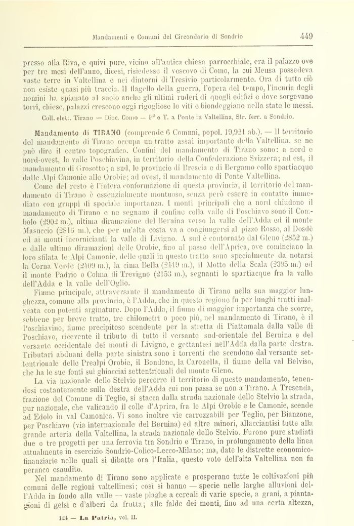 Come del resto è l'intera conformazione ili questa provincia, il territorio del mandamento di Tirano è essenzialmente montuoso, senza però essere in contatto immediato con gruppi di speciale importanza. 1 monti principali che a nord chiudono il mandamento di Tirano e ne segnano il confine colla valle di Poschiavo sono il Con> bolo (2902 m.), ultima diramazione del Bernina verso la valle dell'Adda ed il monte Masuccio (2S10 in.), che per un'alta costa va a congiungersi al pizzo Rosso, al Dosdò ed ai monti incornicianti la valle di Livigno. A sud è contornato dal Cileno (2852 ni.) e dalle ultime diramazioni delle Orobie, fino al passo dell'Aprica, ove cominciano la loro stilata le Alpi Camonie, delle quali in questo tratto sono specialmente da notarsi la Corna Verde (2109 in.), la cima Bella (21-19 in.), il Motto della Scala (2395 m.) ed il monte Padrio o Colma di Trevigno (2153 ni.), segnanti lo spartiacque fra la valle dell'Adda e la valle dell'Oglio.