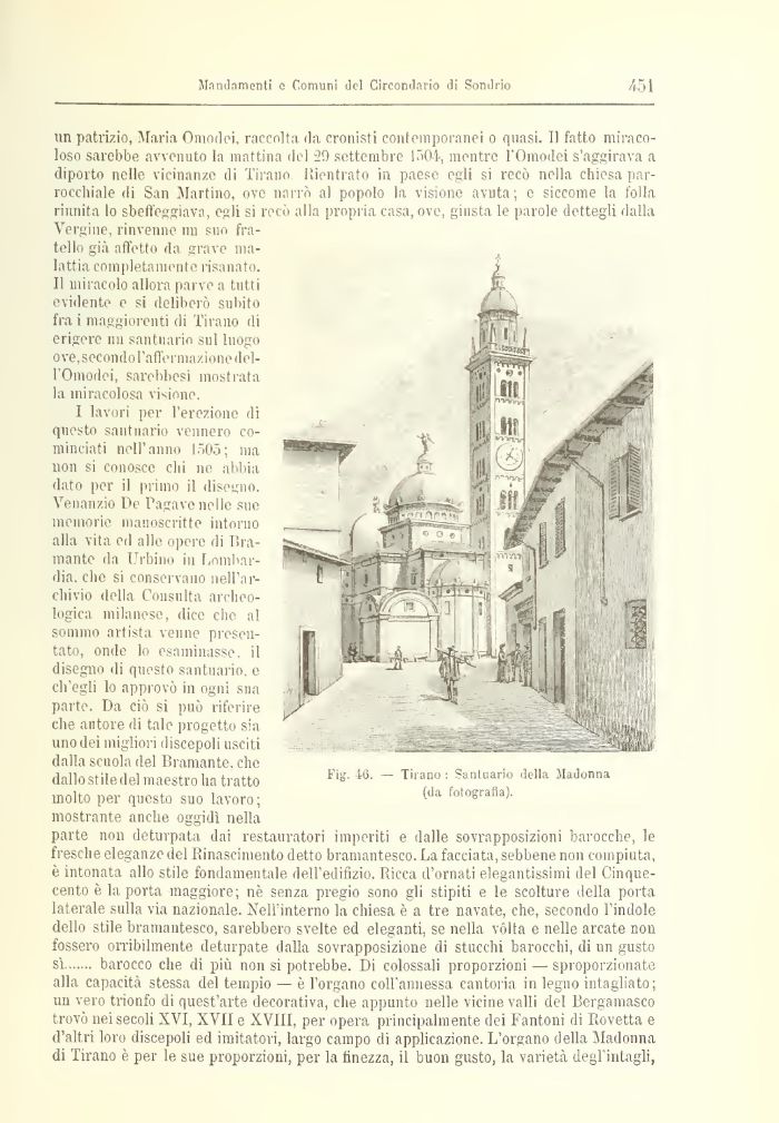 un patrizio, Maria Omodei, raccolta da cronisti contemporanei o quasi. Il fatto miracoloso sarebbe avvenuto la mattina del 29 settembre 1 504, mentre l'Omodei s'aggirava a diporto nelle vicinanze di Tirano Rientrato in paese egli si recò nella chiesa parrocchiale di San Martino, ove narrò al popolo la visione avuta; e siccome la folla riunita lo sbeffeggiava, egli si recò alla propria casa, ove, giusta le parole dettegli dalla Vergine, rinvenne un suo fratello già affetto da grave malattia completamente risanato. 11 miracolo allora parve a tutti evidente e si deliberò subito fra i maggiorenti di Tirano di erigere un santuario sul luogo o ve, sec on d o l'afl e r m az io ne del-l'Oinodei, sarebbesi mostrata la miracolosa visione.