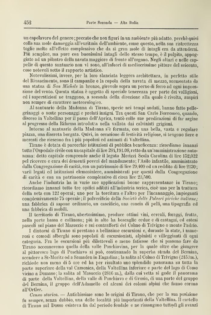 I dintorni di Tirano si prestano a bellissime escursioni e, durante la state, i numerali e comodi alberghi sono popolati di escursionisti, alpinisti e villeggianti di ogni categoria. Fra le escursioni più dilettevoli e meno faticose che si possono fare da Tirano accenneremo quella della valle Poscliiavina, per la quale oltre che giungere al pittoresco lago di Poscbiavo si può, continuando la superba strada del Bernina, scendere a St-Moritz od a Saniaden in Engadina ; la salita al Colmo di Trivigno (2153111.), richiede non meno di 5 ore ed ha per risultato uno splendido panorama su tutta la parte supcriore della vai Camonica. della Valtellina inferiore e parte del lago di Como vicino a Doinaso; la salita al Masuccio (281G 111.), dalla cui vetta si gode il panorama di parte della Valtellina, della valle di Poscbiavo e di Grosio, di una parte del gruppo del Bernina, il gruppo deirAdaiuello ed alcuni dei colossi alpini che fauno corona all'Ortler.