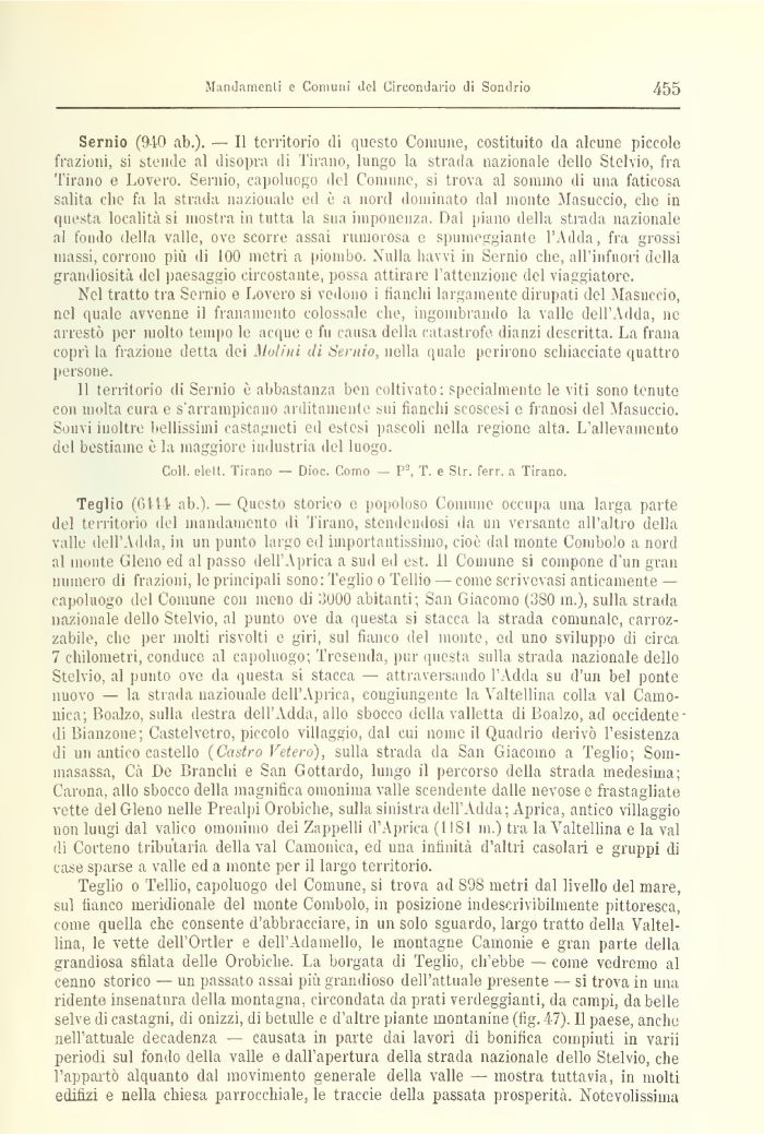 Teglio (G1H ab.). — Questo storico e popoloso Comune occupa una larga parte del territorio del mandamento di Tirano, stendendosi da un versante all'altro della valle dell'Adda, in un punto largo ed importantissimo, cioè dal monte Coinbolo a nord al monte Gleno ed al passo dell Vplica a sud ed est. Il Comune si compone d'un gran numero di frazioni, le principali sono: Teglio o Tellio — come scriv evasi anticamente — capoluogo del Comune con meno di 3000 abitanti; San Giacomo (380 in.), sulla strada nazionale dello Stelvio, al punto ove da questa si stacca la strada comunale, carrozzabile, che per molti risvolti e giri, sul fianco del monte, ed uno sviluppo di circa 7 chilometri, conduce, al capoluogo; Tresenda, pur questa sulla strada nazionale dello Stelvio, al punto ove da questa si stacca — attraversando l'Adda su d'un bel ponte nuovo — la strada nazionale dell'Aprica, cougiungente la Valtellina colla vai Camonica; Boalzo, sulla destra dell'Adda, allo sbocco della valletta di Boalzo, ad occidente di Bianzone; Castelvetro, piccolo villaggio, dal cui nome il Quadrio derivò l'esistenza di un antico castello (Castro Velerò), sulla strada da San Giacomo a Teglio; Som-masassa, Cà De Branchi e San Gottardo, lungo il percorso della strada medesima; Canuta, allo sbocco della magnifica omonima valle scendente dalle nevose e frastagliate vette del Gleno nelle Prealpi Orobiche, sulla sinistra dell' Adda; Aprica, antico villaggio non lungi dal valico omonimo dei Zappelli d'Aprica (1181 ni.) tra la Valtellina e la vai di Corteno tributaria della vai Camonica, ed una infinità d'altri casolari e gruppi di case sparse a valle ed a monte per il largo territorio.