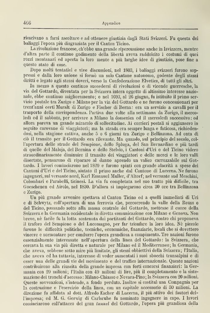 Iti mezzo a questo continuo succedersi di rivoluzioni e di vicende guerresche, la via del Gottardo, diventata per la Svizzera intera oggetto di altissimo interesse nazionale, ebbe continuo miglioramento; e nel 1693, al 26 giugno, fu istituito il primo servizio postale tra Zurigo e Milano per la via del Gottardo e ne furono concessionari per trent'anni certi Murait di Zurigo e Fischer di Berna: era un servizio a cavalli per il trasporto della corrispondenza. Partiva due volte alla settimana da Zurigo, il mercoledì ed il sabbato, per arrivare a Milano la domenica ed il mercoledì successivo : ed allora pareva 1111 grande miracolo di sollecitudine. Ai corrieri postali si aggiunsero in seguito carovane di viaggiatori ; ma la strada era sempre lunga e faticosa, richiedendosi, nella stagione cattiva, anche 5 0 6 giorni tra Zurigo e Bellinzona. Ad onta di ciò il transito per il Gottardo era rilevante. Ma quando, sul principio del secolo, col-l'apertura delle strade del Sempione, dello Spluga, del San Bernardino e più tardi di quelle del Maloja, del Bernina e dello Stelvio, i Cantoni d'Uri e del Ticino videro straordinariamente diminuire il transito dei viaggiatori e delle merci e le loro valli disertate, pensarono di riparare al danno aprendo un valico carrozzabile sul Gottardo. I lavori cominciarono nel 1820 e furono spinti con grande alacrità a spese dei Cantoni d'Uri e del Ticino, aiutato il primo anche dal Cantone di Lucerna. Ne furono ingegneri, sul versante nord, Karl Emanuel Muller, d'Altorf ; nel versante sud Meschini, Colombari e Parabelli, ticinesi. La via fu completata nel suo tratto più difficile, tra Goeschenen ed Airolo, nel 1830. D'allora si impiegarono circa 30 ore tra Bellinzona e Zurigo.