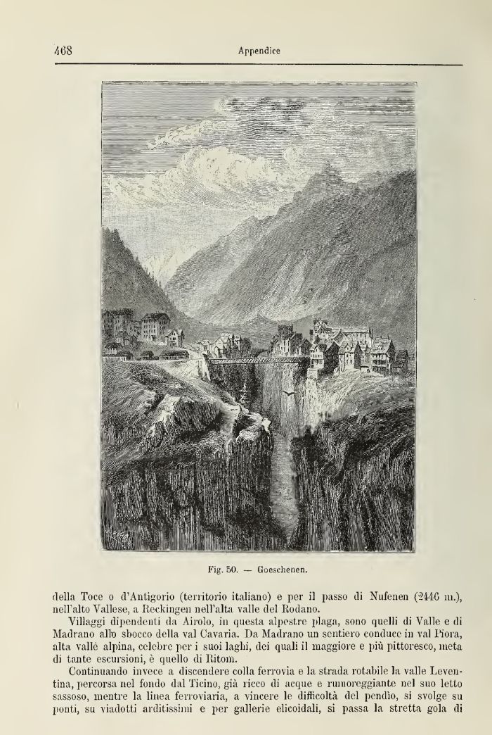 Continuando invece a discendere colla ferrovia e la strada rotabile la valle Leventina, percorsa nel fondo dal Ticino, già ricco di acque e rumoreggiante nel suo letto sassoso, mentre la linea ferroviaria, a vincere le differita del pendìo, si svolge su ponti, su viadotti arditissimi e per gallerie elicoidali, si passa la stretta gola di
