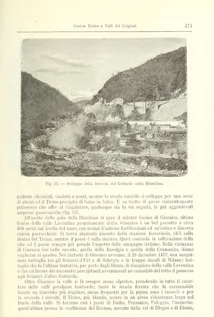 gallerie elicoidali, viadotti e ponti, mentre la strada rotabile si sviluppa per una serie di gironi ed il Ticino precipita di balza in balza. È ini tratto di paese eminentemente pittoresco che offre al viaggiatore, qualunque sia la via seguita, le più aggradevoli sorprese panoramiche (fig. 52).