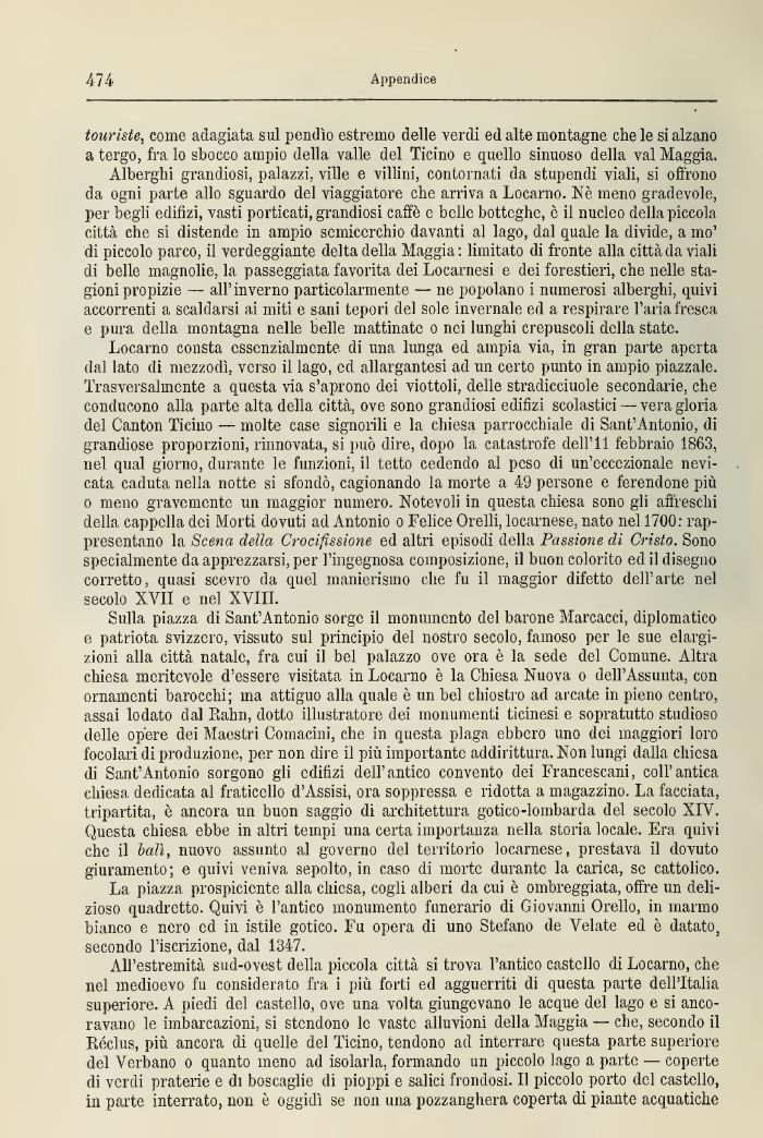 Alberghi grandiosi, palazzi, ville e villini, contornati da stupendi viali, si offrono da ogni parte allo sguardo del viaggiatore che arriva a Locamo. Nè meno gradevole, per begli edifizi, vasti porticati, grandiosi caffè e belle botteghe, è il nucleo della piccola città che si distende in ampio semicerchio davanti al lago, dal quale la divide, a mo' di piccolo parco, il verdeggiante delta della Maggia: limitato di fronte alla città da viali di belle magnolie, la passeggiata favorita dei Locarnesi e dei forestieri, che nelle stagioni propizie — all'inverno particolarmente — ne popolano i numerosi alberghi, quivi accorrenti a scaldarsi ai miti e sani tepori del sole invernale ed a respirare l'aria fresca e pura della montagna nelle belle mattinate o nei lunghi crepuscoli della state.