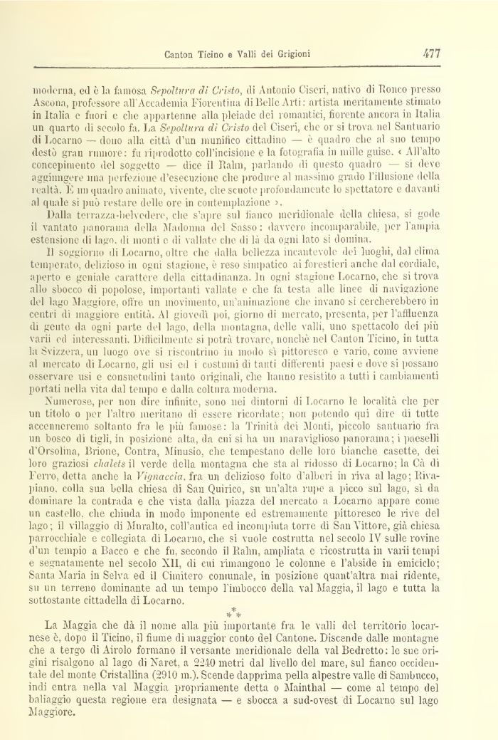 inodorila, ed èia famosa Sepoltura eli Cristo, di Antonio Ciseri, nativo di Ronco presso Ascona, professore ali Accademia fiorentina di Belle Arti artista meritamente stimato in Italia e fuori e che appartenne alla pleiade dei romantici, fiorente ancora 111 Italia un quarto di secolo fa. La Sepoltura di Cristo del Ciseri, che or si trova nel Santuario di Locamo — dono alla città d'un munifico cittadino — è quadro che al suo tempo destò gran rumore: fu riprodotto coH'incisione e la fotografia in mille guise. < All'alto concepimento del soggetto — dice il Balia parlando ili questo quadro — si deve aggiungere mia perfezione d'esecuzione che produce al massimo grado 1 illusione della realtà. E mi quadro animato, vivente, che scuote profondamente lo spettatore e davanti al quale si può restare delle ore in contemplazione >.