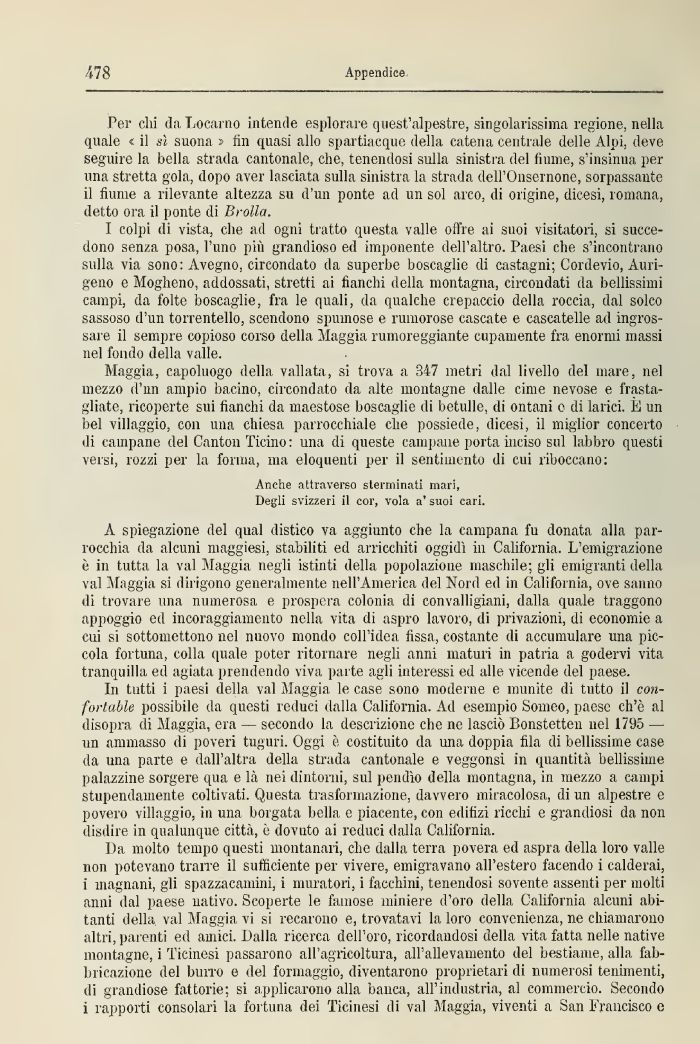 A spiegazione del qual distico va aggiunto che la campana fu donata alla parrocchia da alcuni maggiesi, stabiliti ed arricchiti oggidì in California. L'emigrazione è in tutta la vai Maggia negli istinti della popolazione maschile; gli emigranti della vai Maggia si dirigono generalmente nell'America del Nord ed in California, ove sanno di trovare una numerosa e prospera colonia di convalligiani, dalla quale traggono fflipogglo ed incoraggiamento nella vita di aspro lavoro, di privazioni, di economie a cui si sottomettono nel nuovo mondo coll'idea fissa, costante di accumulare una piccola fortuna, colla quale poter ritornare negli anni maturi in patria a godervi vita tranquilla ed agiata prendendo viva parte agli interessi ed alle vicende del paese.