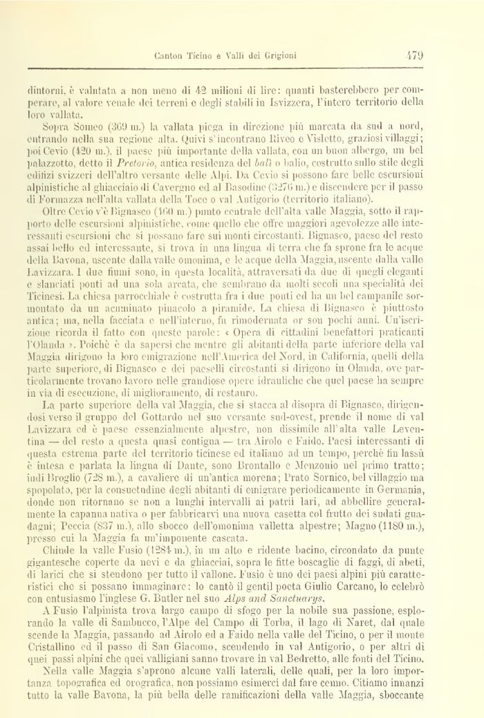 Chiude la valle Fusio (1284 ni.), in un alto e ridente bacino, circondato da punte gigantesche coperte da nevi e da ghiacciai, sopra le fitte boscaglie di faggi, di abeti, di larici che si stendono per tutto il vallone. Fusio è uno dei paesi alpini piti caratteristici che si possano immaginare: lo cantò il gentil poeta Giulio Carcano, lo celebro con entusiasmo l'inglese G. Butler nel suo AIps and Sanctuarys.