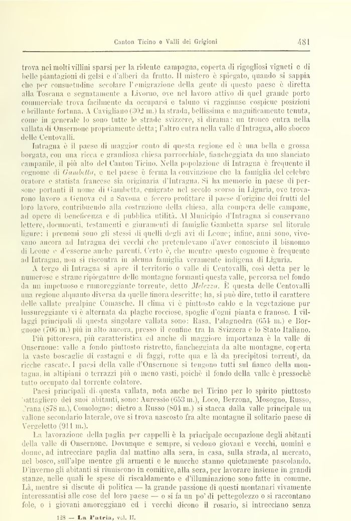 Ini ragna è il paese ili maggior conto ili questa regione ed è una bella e grossa borgata, con una ricca e grandiosa chiesa parroci hiale, fiancheggiata da uno slanciato campanile, il più alto del (anton ricino. Nella popolazione di Intragna è frequente il cognome di Oambdlo, e nel paese è ferma la convinzione che la famiglia del celebre oratore, e statista francese sia originaria d'Intruglia, Si ha memorie in paese di persone portanti il nome di Gambetta, emigrate nel secolo scorso in Liguria, ove trovarono lavoro a (umova ed a Savona e fecero profittare il paese d'origine dei frutti del loro lavoro, contribuendo alla costruzione della chiesa, alla compera delle campane, ad opere, ili beneliceuza e di pubblica utilità. \l Municipio dlntragna si conservano lettere, documenti, testamenti e giuramenti di famiglie Gambetta sparse sul litorale ligure: i prenomi sono gli stessi ili quelli degli avi di Leone; infine, anni sono, vivevano ancora ad Intragna dei vecchi che pretendevano d'aver conosciuto il bisnonno ili Leone e d'esserne anche parenti. Certo è, che mentre questo cognome è frequente ad Intragna, non si riscontra m alcuna famiglia veramente indigena di Liguria.