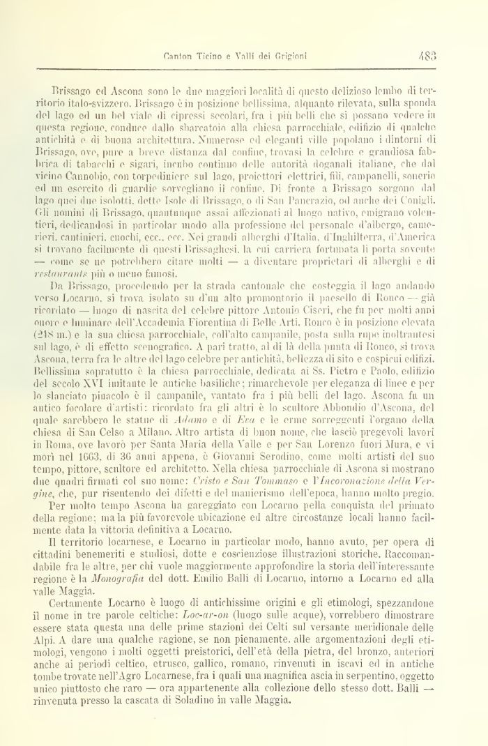 Da P.rissago, procedendo per la strada cantonale che costeggia il lago andando verso Locamo, si trova isolato su (Fini alto promontorio il paesello di Ronco — già ricordato - luogo di nascita del celebre pittore Antonio Cisori, che fu per molti anni onore e luminare dell'Accademia Fiorentina di Belle Arti. Ronco è in posiziono elevala (ÌÌS 111.) e la sua chiesa parrocchiale, coll'alto campanile, posta sulla rupe inoltrantesi sul lago, è di effetto scenografico. A pari tratto, al di là della punta di Ronco, si trova Ascolta, terra fra lo altre del lago celebre per antichità, bellezza di sito e cospicui edifizi. Bellissima sopratutto è la chiesa parrocchiale, dedicata ai Ss. Pietro e Paolo, edifizio del secolo XVI imitante le antiche basiliche; rimarchevole per eleganza di linee e pollo slanciato pi 11 a colo è il campanile, vantato fra i più belli del lago. A scoila fu un antico focolare d'artisti: ricordato fra gli altri è lo scultore Abbondio d'Ascona, del quale sarebbero le statue di iihim e di Eva e le erme sorreggenti l'organo della chiesa di San Celso a Milano. Vitro artista di buon nome, che lasciò pregevoli lavori in Roma, ove lavoro per Santa Maria della Valle e per San Lorenzo fuori Mura, e vi morì nel 1GG3. di 3G anni appena, è Giovanni Serodino, come molti artisti del suo tempo, pittore, scultore ed architetto. Nella chiesa parrocchiale di Ascona si mostrano due quadri firmati col suo nome: Cristo e San Tommaso e Vincoronazione drìta Vergine, che, pur risentendo dei difetti e del manierismo dell'epoca, hanno molto pregio.