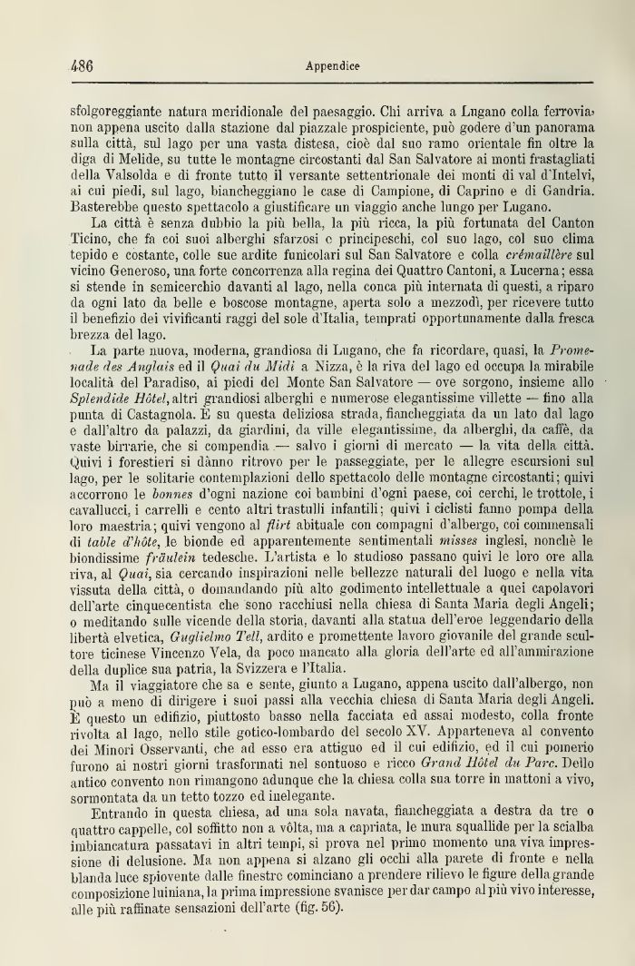 La parte nuova, moderna, grandiosa di Lugano, che fa ricordare, quasi, la Promenade des Anglaìs ed il Quai du Midi a Nizza, è la riva del lago ecl occupa la mirabile località del Paradiso, ai piedi del Monte San Salvatore — ove sorgono, insieme allo Splendide Hotel, altri grandiosi alberghi e numerose elegantissime villette — fino alla punta di Castagnola. E su questa deliziosa strada, fiancheggiata da un lato dal lago e dall'altro da palazzi, da giardini, da ville elegantissime, da alberghi, da caffè, da vaste birrarie, che si compendia — salvo i giorni di mercato — la vita della città. Quivi i forestieri si dànno ritrovo per le passeggiate, per le allegre escursioni sul lago, per le solitarie contemplazioni dello spettacolo delle montagne circostanti; quivi accorrono le honnes d'ogni nazione coi bambini d'ogni paese, coi cerchi, le trottole, i cavallucci, i carrelli e cento altri trastulli infantili; quivi i ciclisti fanno pompa della loro maestria; quivi vengono al flirt abituale con compagni d'albergo, coi commensali di tahle dhote, le bionde ed apparentemente sentimentali misses inglesi, nonché le biondissime frani ehi tedesche. L'artista e lo studioso passano quivi le loro ore alla riva, al Quai, sia cercando inspirazioni nelle bellezze naturali del luogo e nella vita vissuta della città, o domandando più alto godimento intellettuale a quei capolavori dell'arte cinquecentista che sono racchiusi nella chiesa di Santa Maria degli Angeli; o meditando sulle vicende della storia, davanti alla statua dell'eroe leggendario della libertà elvetica, Guglielmo Teli, ardito e promettente lavoro giovanile del grande scultore ticinese Vincenzo Vela, da poco mancato alla gloria dell'arte ecl all'ammirazione della duplice sua patria, la Svizzera e l'Italia.