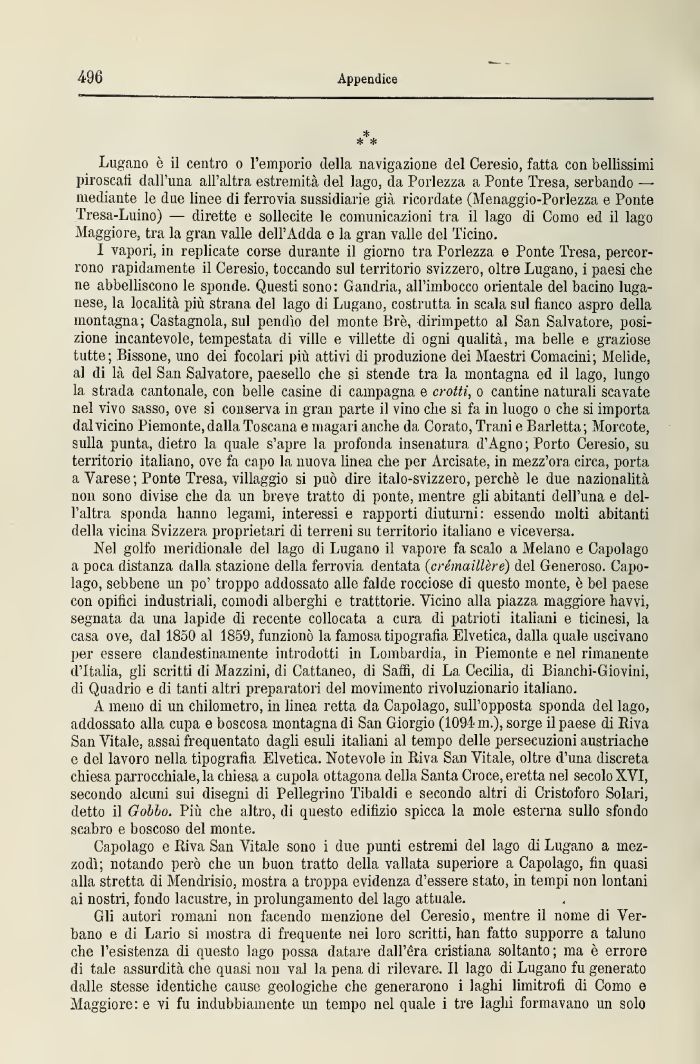 Nel golfo meridionale del lago di Lugano il vapore fa scalo a Melano e Capolago a poca distanza dalla stazione della ferrovia dentata (crémaìUère) del Generoso. Capo-lago, sebbene un po' troppo addossato alle falde rocciose di questo monte, è bel paese con opifici industriali, comodi alberghi e tratttorie. Vicino alla piazza maggiore havvi, segnata da una lapide di recente collocata a cura di patrioti italiani e ticinesi, la casa ove, dal 1850 al 1859, funzionò la famosa tipografia Elvetica, dalla quale uscivano per essere clandestinamente introdotti in Lombardia, in Piemonte e nel rimanente d'Italia, gli scritti di Mazzini, di Cattaneo, di Saffi, di La Cecilia, di Bianchi-Giovini, di Quadrio e di tanti altri preparatori del movimento rivoluzionario italiano.