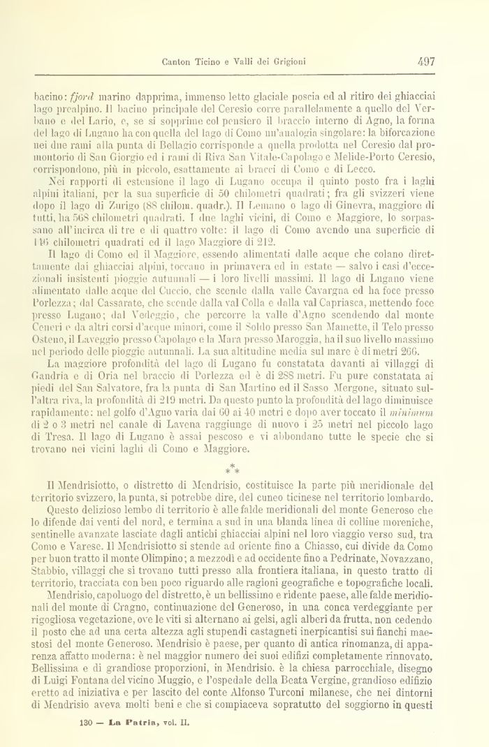 Nei rapporti di estensione il lago di Lugano occupa il quinto posto fra i laghi alpini italiani, per la sua superficie di 50 chilometri quadrati ; fra gli svizzeri viene dopo il lago di Zurigo (SS chiloni. quadr.). Il Remano o lago di Ginevra, maggiore di tutti, ha 508 chilometri quadrati. I due laghi vicini, di Como e Maggiore, lo sorpassano all'iucirca di tre e ili quattro volte: il lago di Como avendo una superficie di 110 chilometri quadrati ed il lago Maggiore di 212.