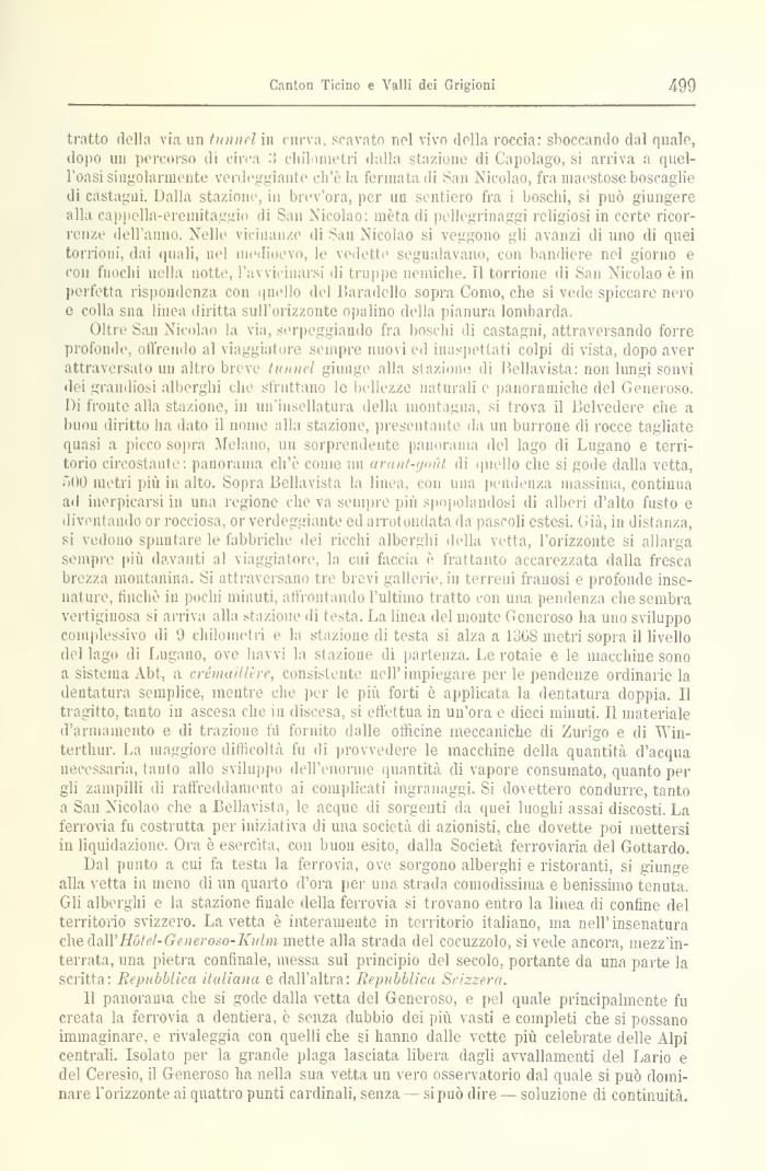 Oltre San Nicolao la via, serpeggiando fra boschi di castagni, attraversando forre profonde, offrendo al viaggiatore sempre nuovi ed inaspettati colpi di vista, dopo aver attraversato un altro breve tunnel giunge alla stazione di Bellavista: non lungi sonvi dei grandiosi alberghi clic sfruttano le bellezze naturali e panoramiche del Generoso. Di fronte alla stazione, in un'insellatura della montagna, si trova il Belvedere che a buon diritto ha dato il nome alla stazione, presentante da un burrone di rocce tagliate quasi a picco sopra .Melano, un sorprendente panorama del lago di Lugano e territorio circostante: panorama ch'è come mi arant-goùt ili quello che si gode dalla vetta, )00 metri più in alto. Sopra Bellavista la linea, con una pendenza massima, continua ad inerpicarsi in una regione che va sempre più spopolandosi di alberi d'alto fusto e diventando or rocciosa, or verdeggiante ed arrotondata da pascoli estesi. Già, in distanza, si vedono spuntare le fabbriche dei ricchi alberghi della vetta, l'orizzonte si allarga sempre più davanti al viaggiatore, la cui faccia è frattanto accarezzata dalla fresca brezza montanina. Si attraversano tre brevi gallerie, iu terreni franosi e profonde insenature, finché in pochi minuti, affrontando l'ultimo tratto con una pendenza che sembra vertiginosa si arriva alla stazione di testa. La linea del monte Generoso ha uno sviluppo complessivo di 9 chilometri e la stazione di testa si alza a 13GS metri sopra il livello del lago di Lugano, ove havvi la stazione di partenza. Le rotaie e le macchine sono a sistema Abt, a crémaillère, consistente nell' impiegare per le pendenze ordinarie la dentatura semplice, mentre che per le più forti è applicata la dentatura doppia. B tragitto, tanto in ascesa che in discesa, si effettua in un'ora e dieci minuti. Il materiale d'armamento e di trazione tu fornito dalle otficine meccaniche di Zurigo e di Win-terthur. La maggiore difficoltà fu ili provvedere le macchine della quantità d'acqua necessaria, tanto allo sviluppo dell'enorme quantità di vapore consumato, quanto per gli zampilli di raffreddamento ai complicati ingranaggi. Si dovettero condurre, tanto a San Nicolao che a Bellavista, le acque di sorgenti da quei luoghi assai discosti. La ferrovia fu costrutta per iniziativa di una società di azionisti, che dovette poi mettersi in liquidazione. Ora è esercita, con buon esito, dalla Società ferroviaria del Gottardo.