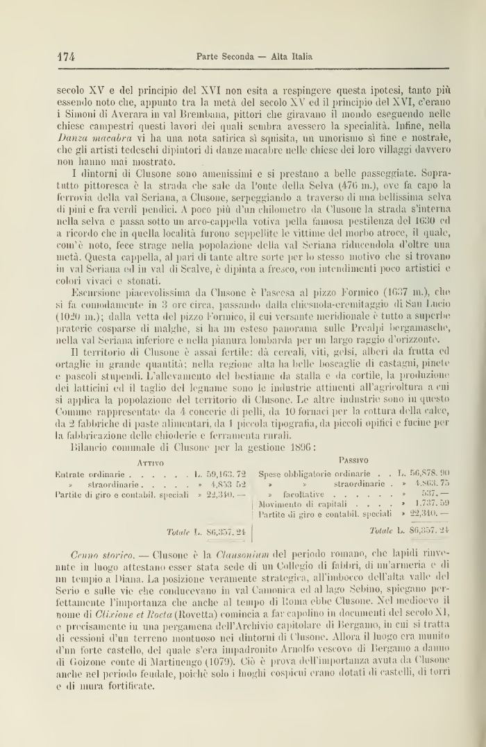 Cenno storico, — Clusone è la Clausonhim del periodo romano, che lapidi rinvenute in luogo attestano esser stata sede di 1111 Collegio di fabbri, di un'armeria e di 1111 tempio a Diana. La posizione veramente strategica, all'imbocco dell'alta valle' ilei Serio e sulle vie che conducevano in vai Camonica ed al lago Sebino, spiegano perfettamente l'importanza che anche al tempo ili Poma ebbe Clusone. Nel medioevo il nome di Clixione et l'oda (Bovetta.) comincia a far capolino in documenti del secolo XI, e precisamente iu una pergamena dell'Archivio capitolare di Bergamo, in cui si tratta di cessioni d'un terreno montuoso nei dintorni di elusone. Allora il luogo era munito d'nn forte castello, del quale s'era impadronito Arnolfo vescovo di Bergamo a danno di Goizone conte di Martiuengo (1070). Ciò è prova dell'importanza avuta da ( lusone anche nel periodo feudale, poiché solo i luoghi cospicui erano dotati ili castelli, di torri e di mura fortificate.